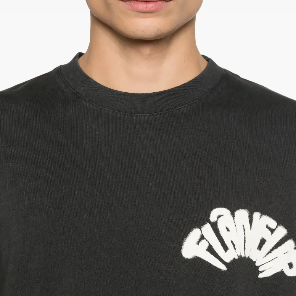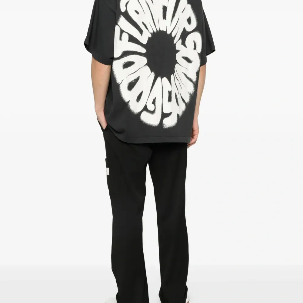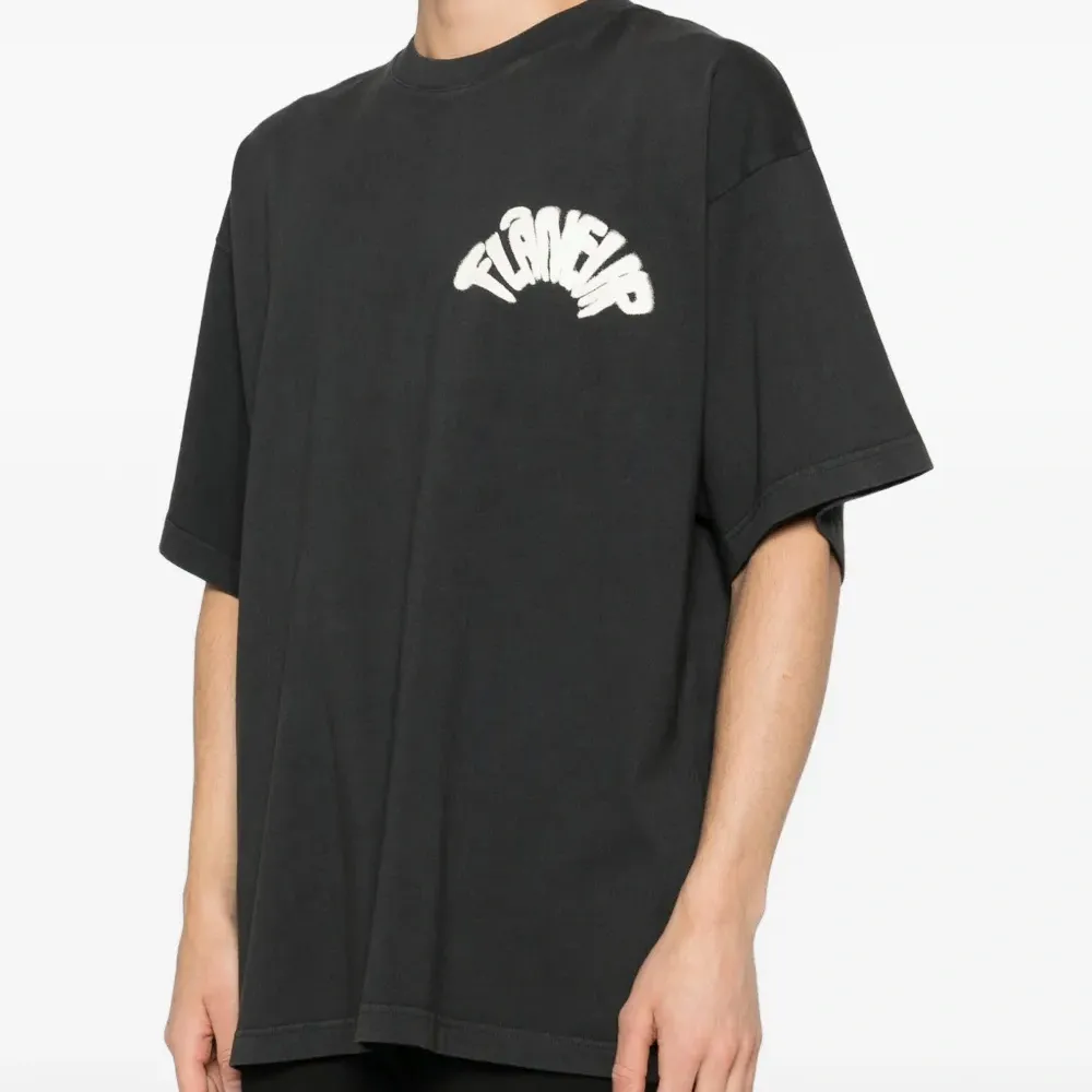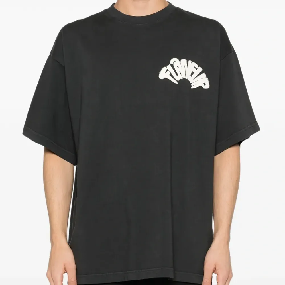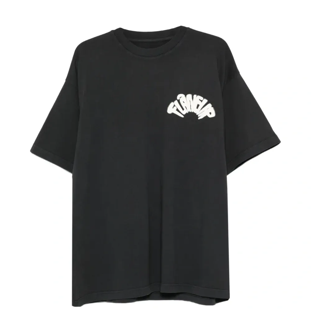 черная футболка с графическим логотипом, круглым вырезом и короткими рукавами