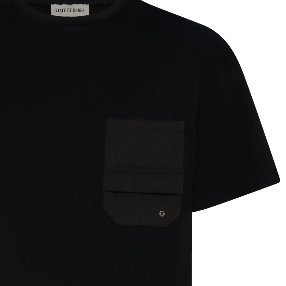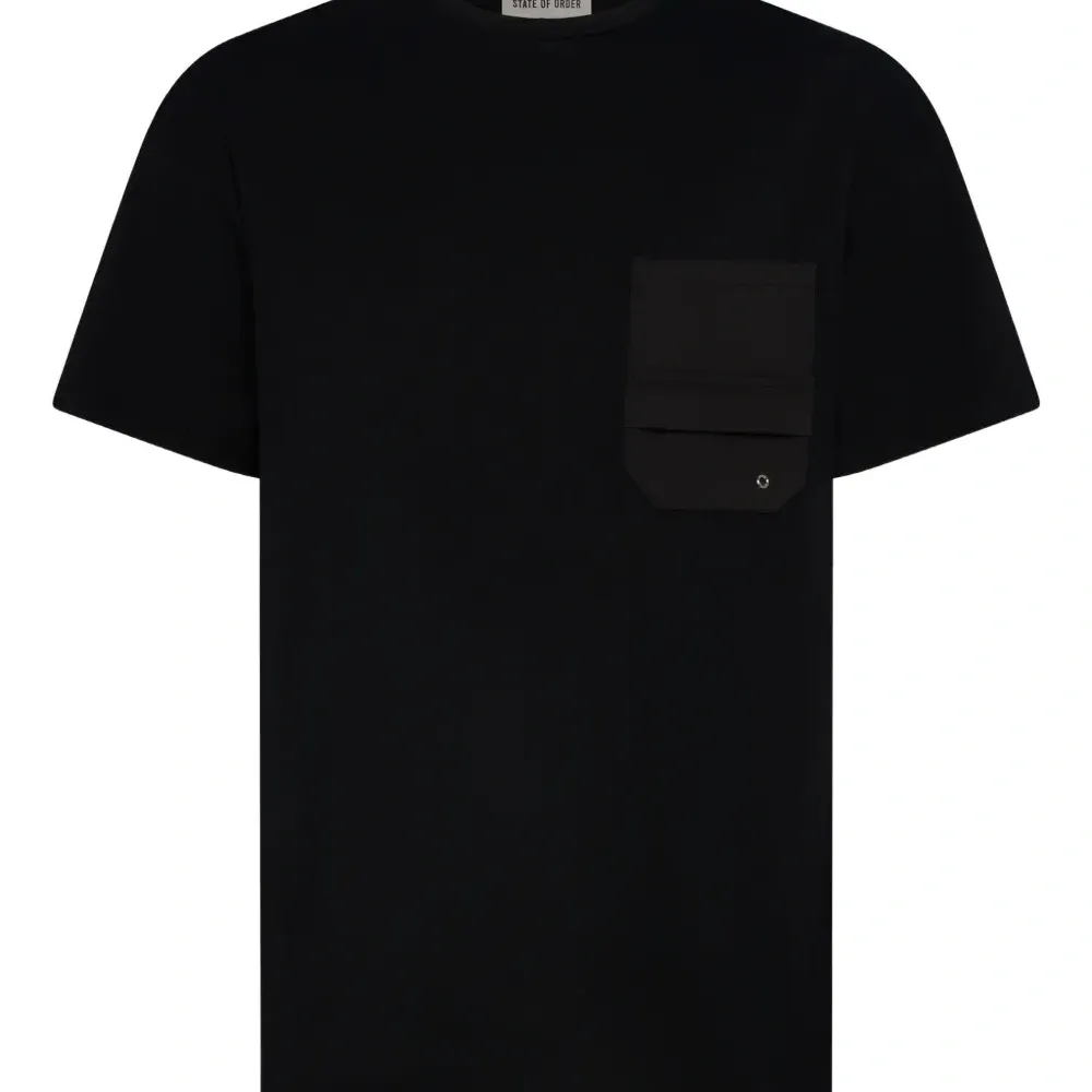 черная футболка с круглым вырезом, нагрудным карманом, короткими рукавами и прямым подолом