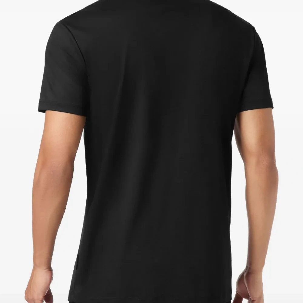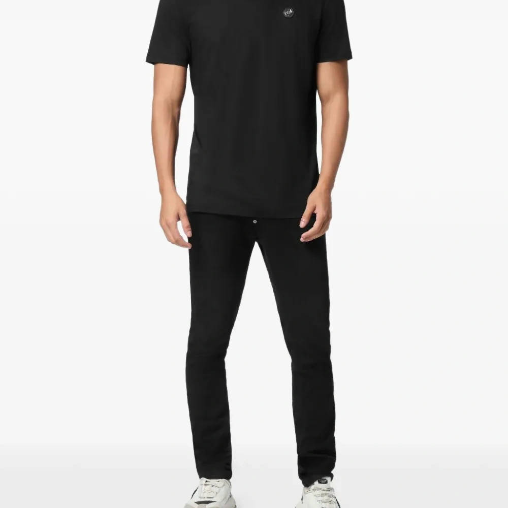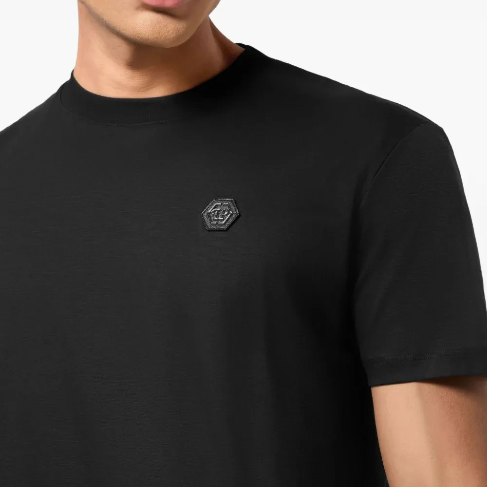 чёрная футболка с круглым вырезом, короткими рукавами и нашивкой с логотипом