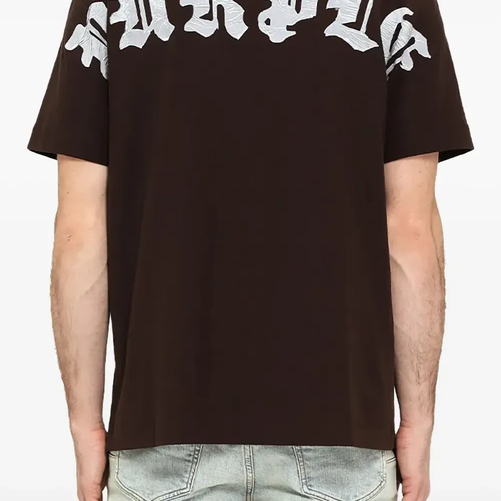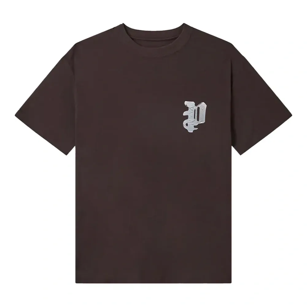 коричневая футболка с короткими рукавами, круглым вырезом и принтом логотипа на груди и спине
