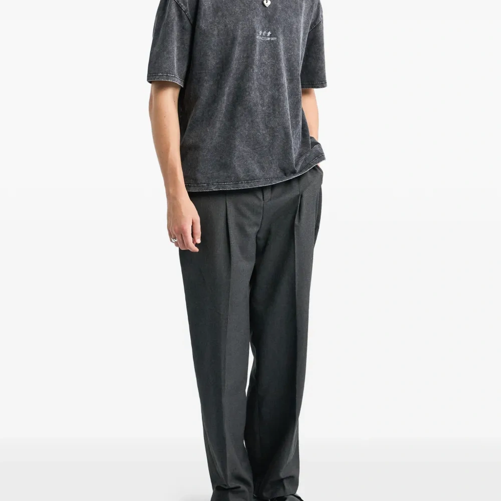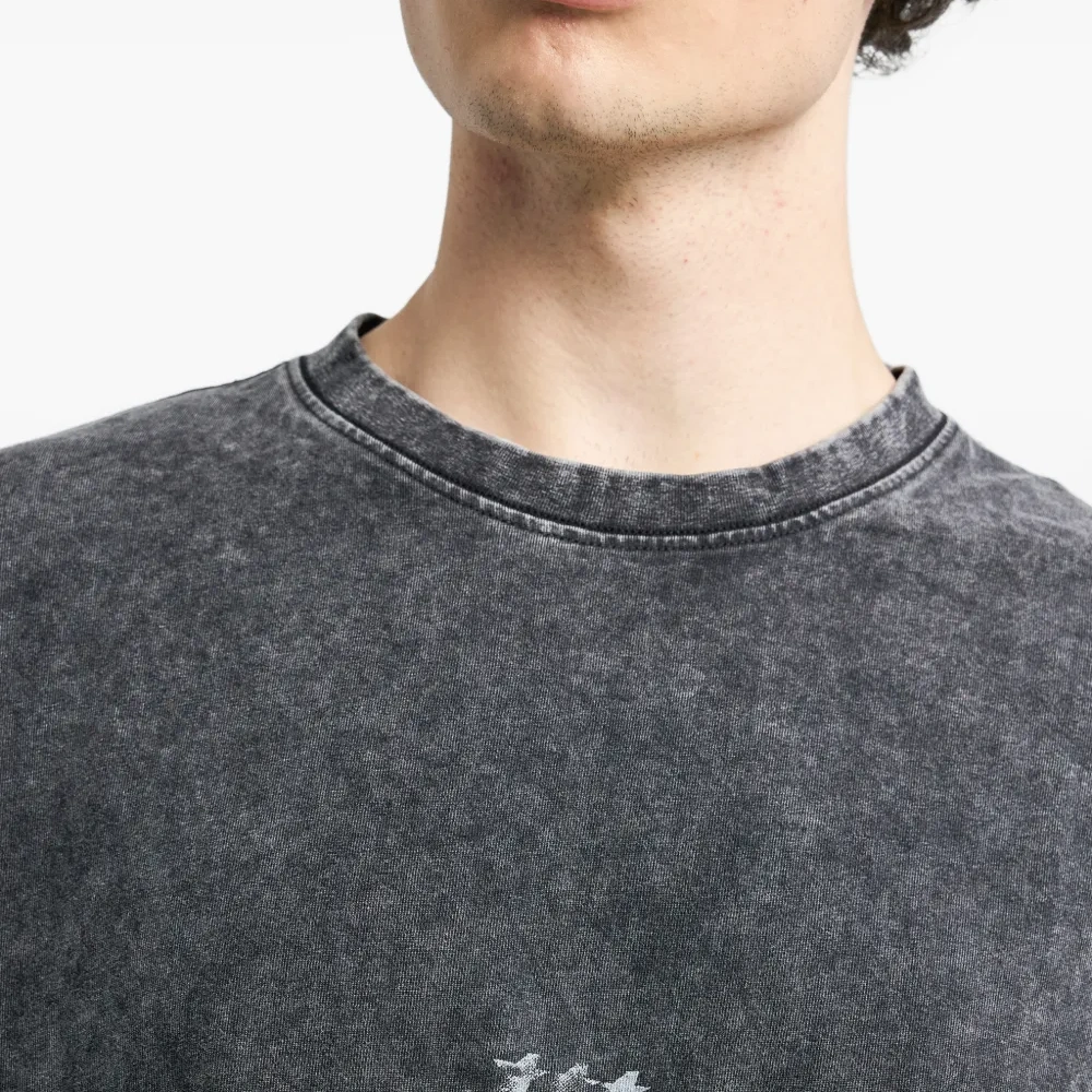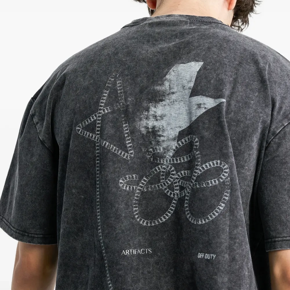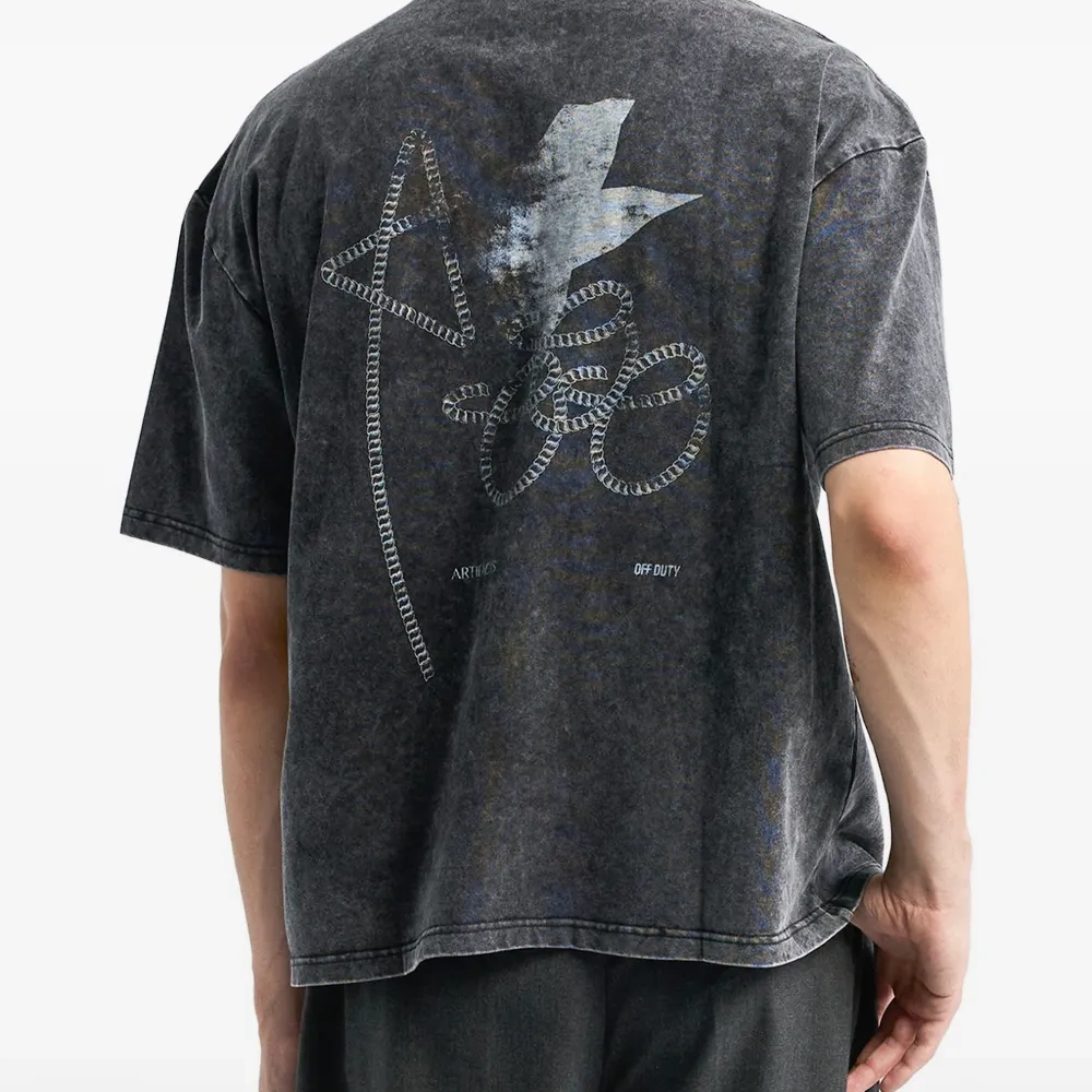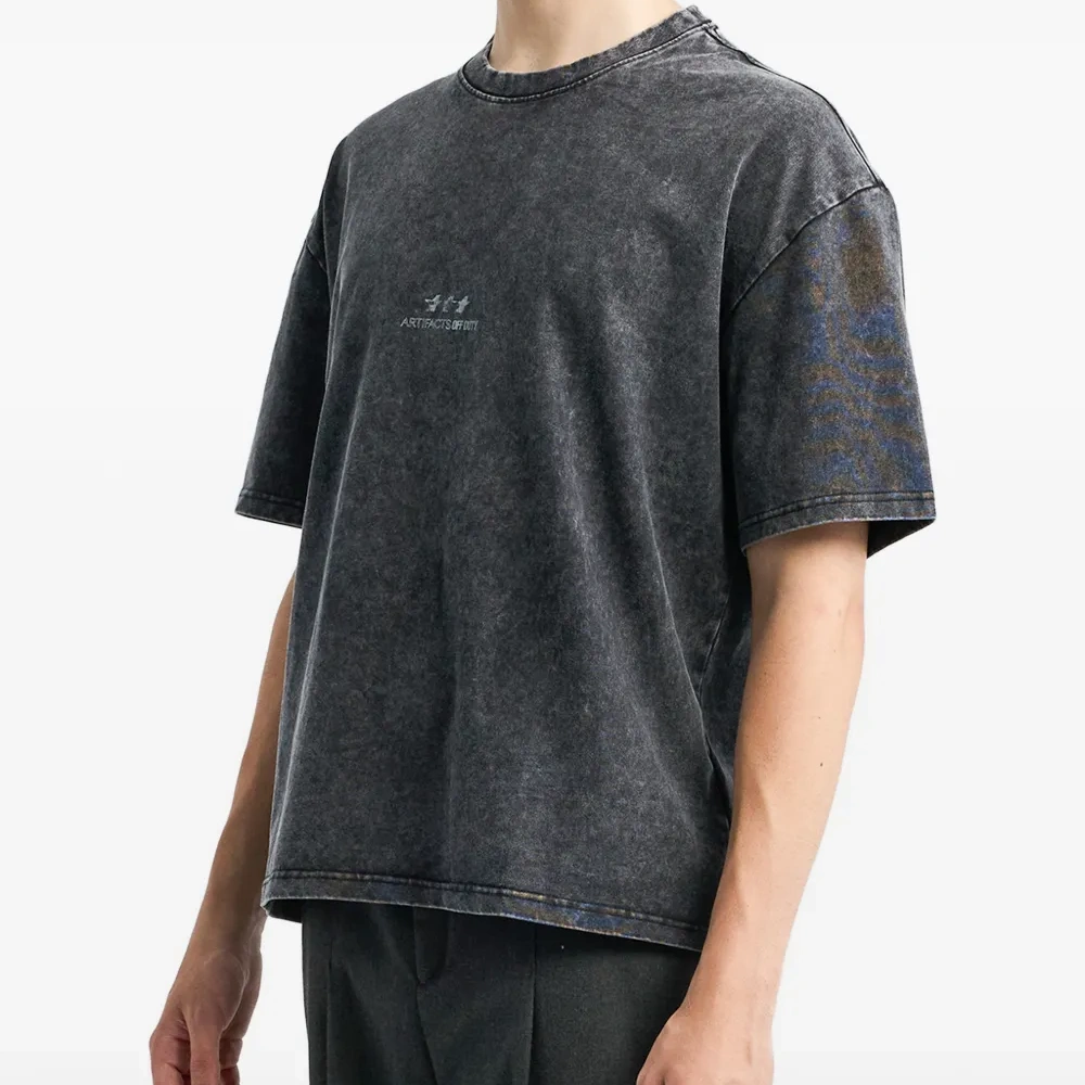 тёмно-серая футболка с графическим принтом, короткими рукавами, тональной отстрочкой и эффектом стирки