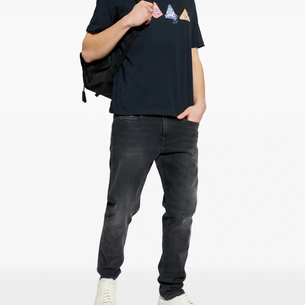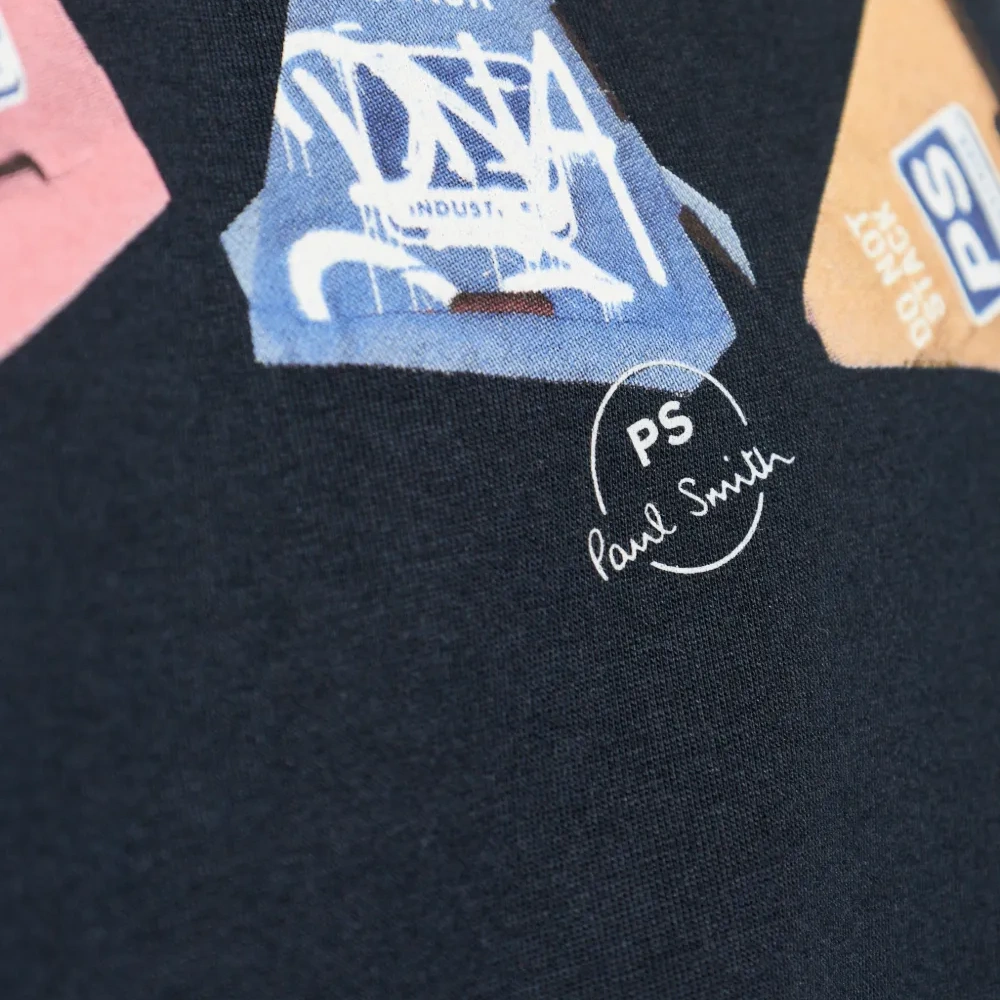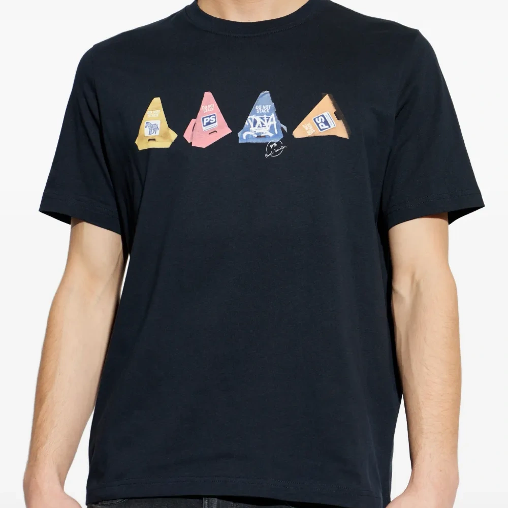 синий свитшот с графическим принтом, круглый вырез, короткие рукава, тональная прострочка