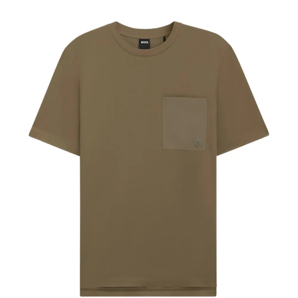 зелёная футболка с накладными карманами, круглым вырезом, короткими рукавами, логотипом и прямым подолом