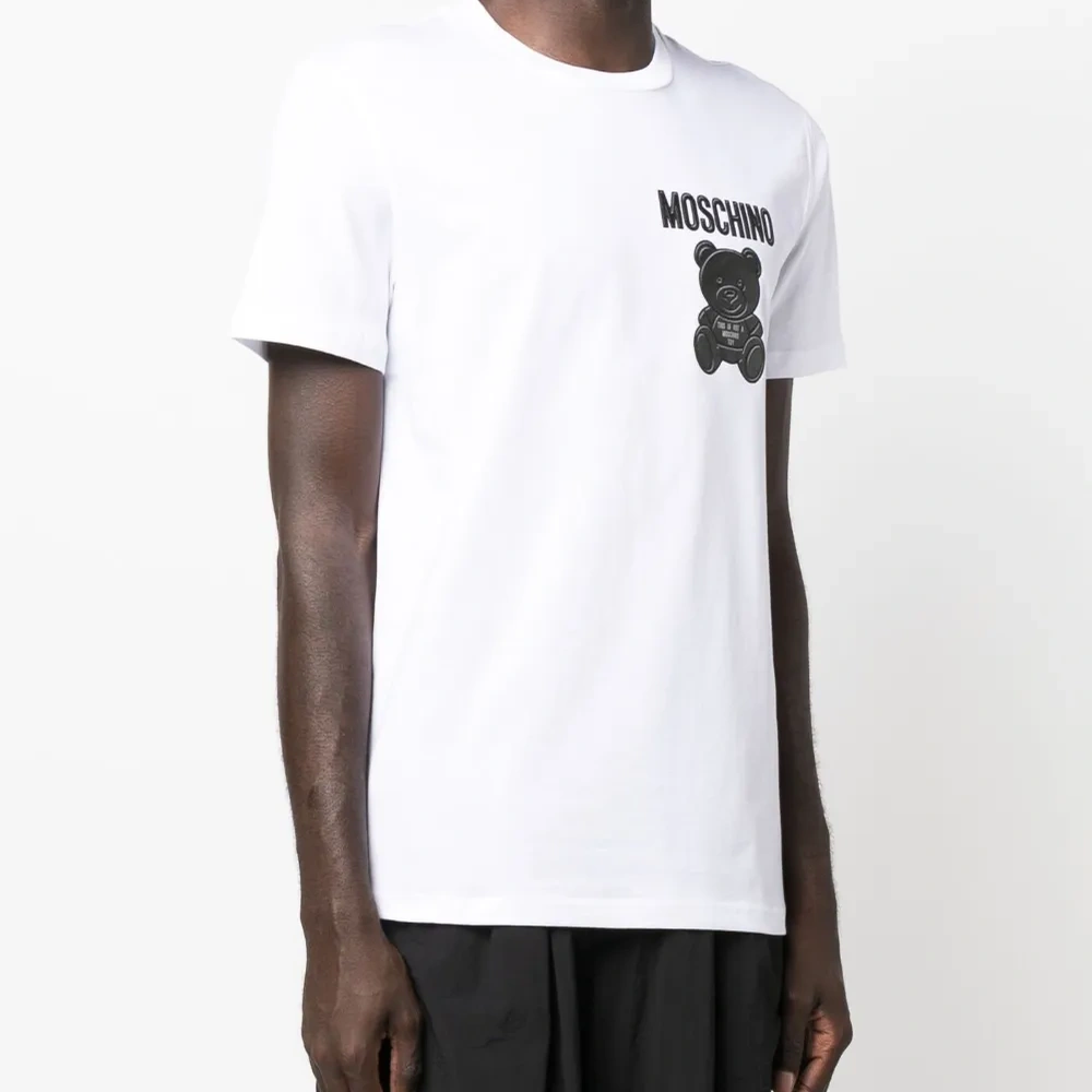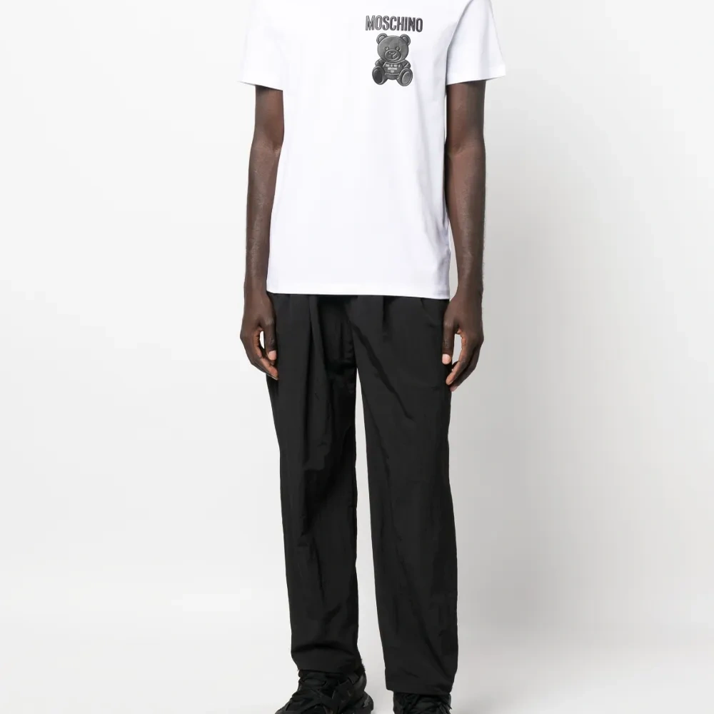 Белый/черный, органический хлопок, принт с логотипом на груди, принт с изображением плюшевого медведя, круглый вырез, короткие рукава и прямой подол. Узнать больше о том, какие товары получают отметку «Ответственный выбор», можно из материала «Как мы оцениваем экологичность и этичность».