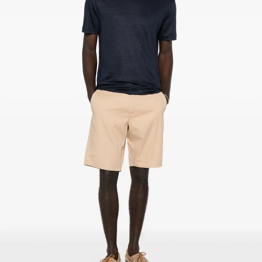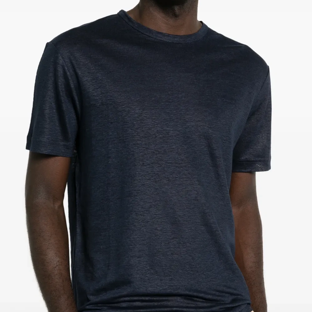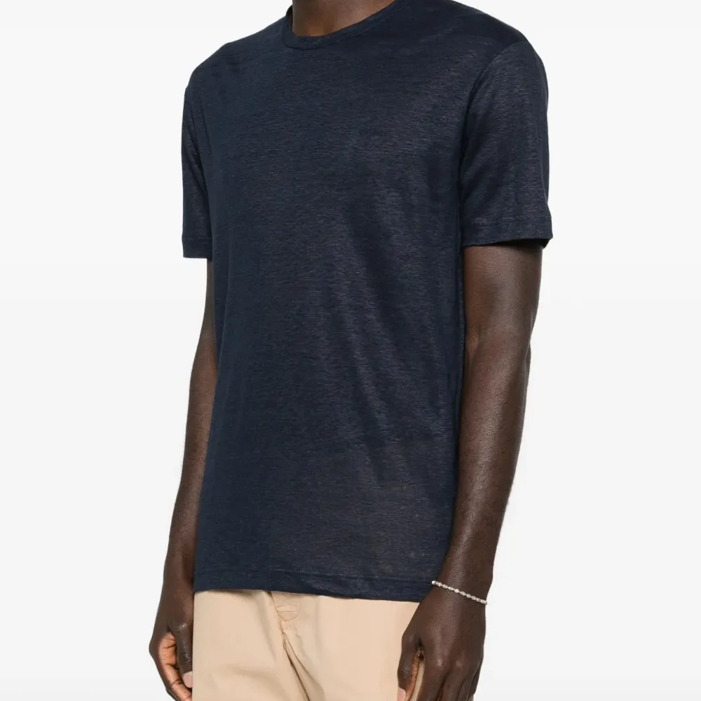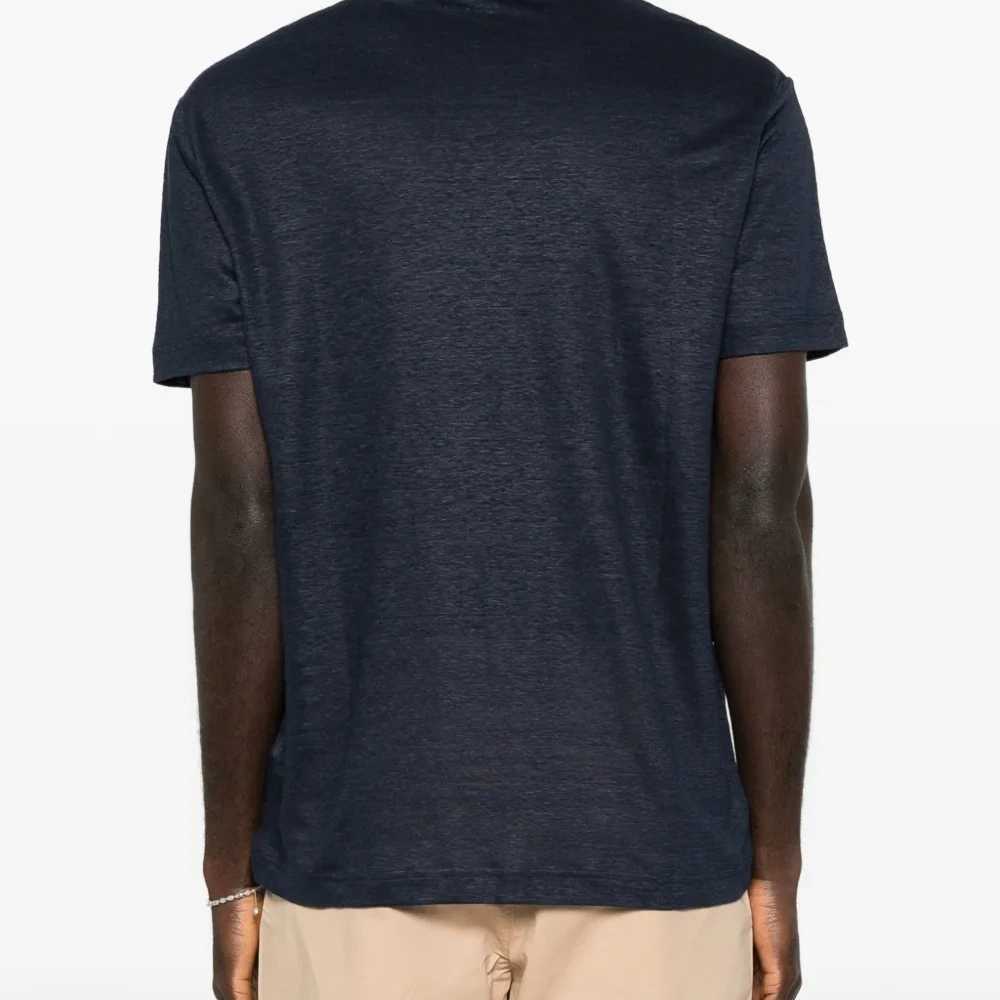 синий пуловер с круглым вырезом, нагрудным карманом, короткими рукавами и прямым подолом