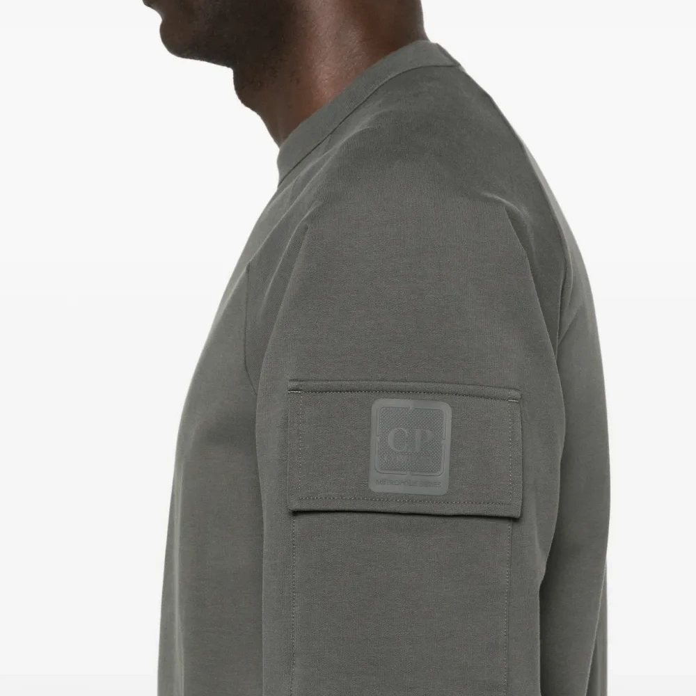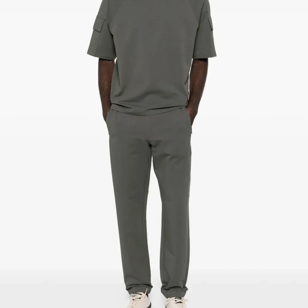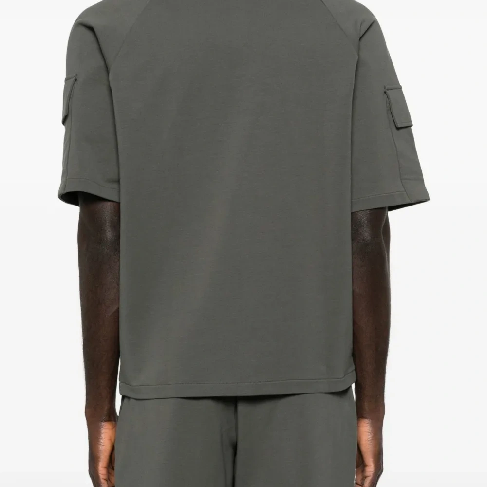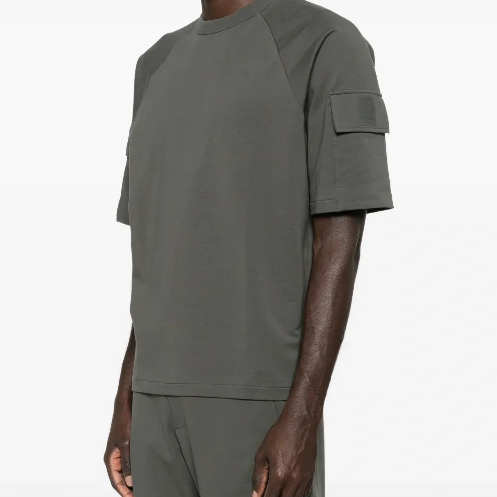 Серый топ с короткими рукавами, накладным карманом, круглым вырезом и прямым подолом