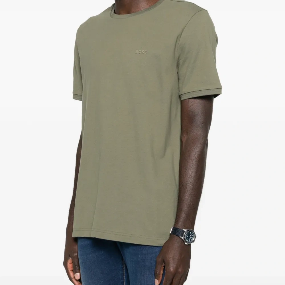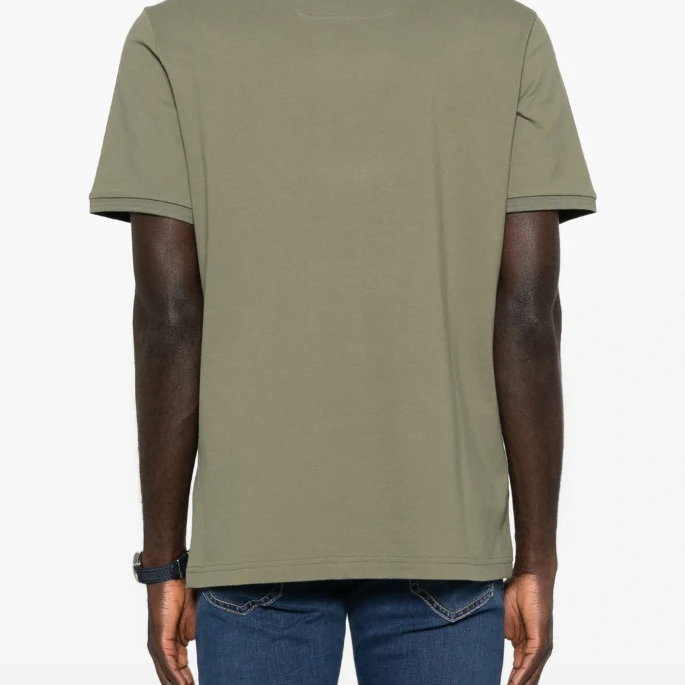 футболка шалфейного зеленого цвета с круглым вырезом, однотонным логотипом, короткими рукавами, прямым подолом и тональной отстрочкой