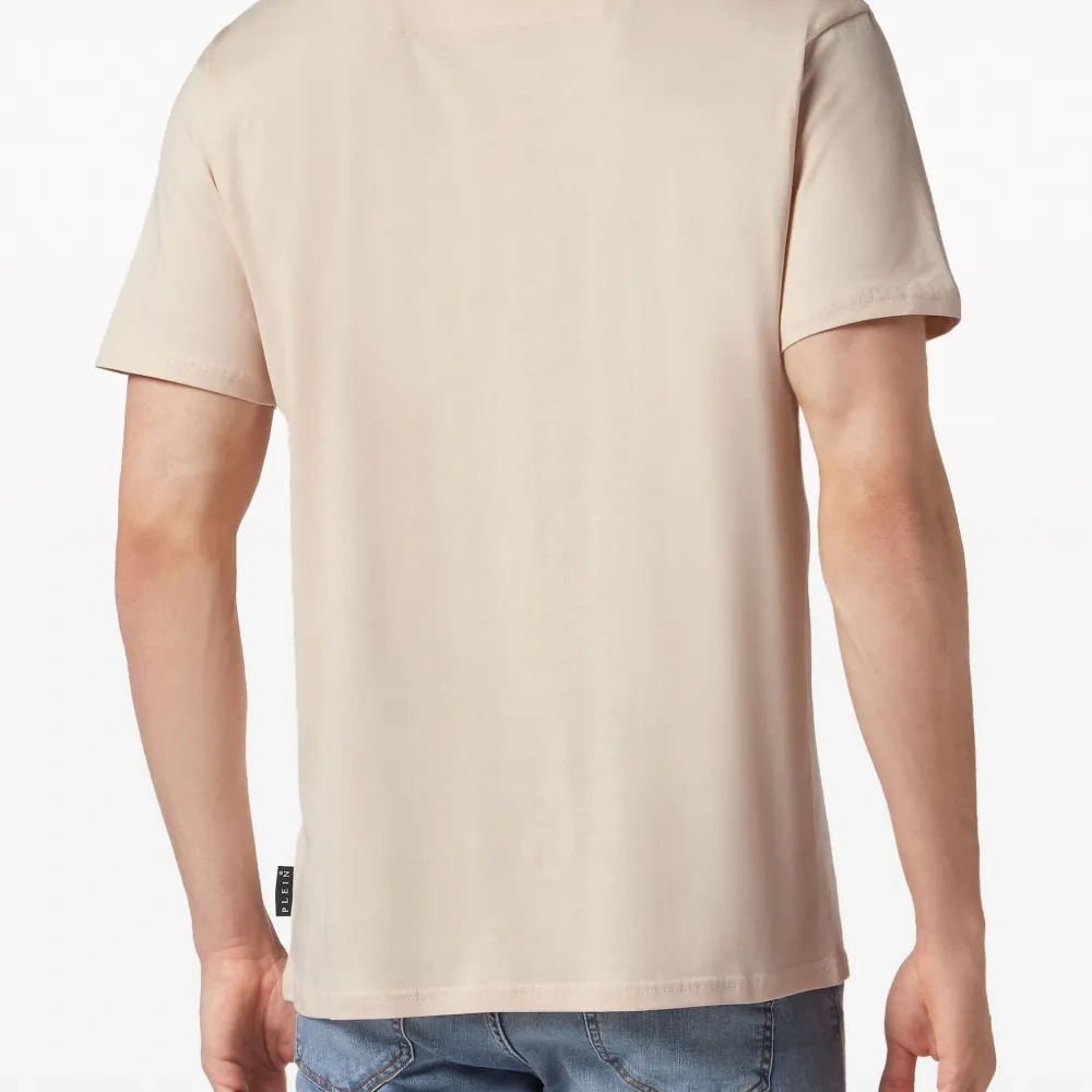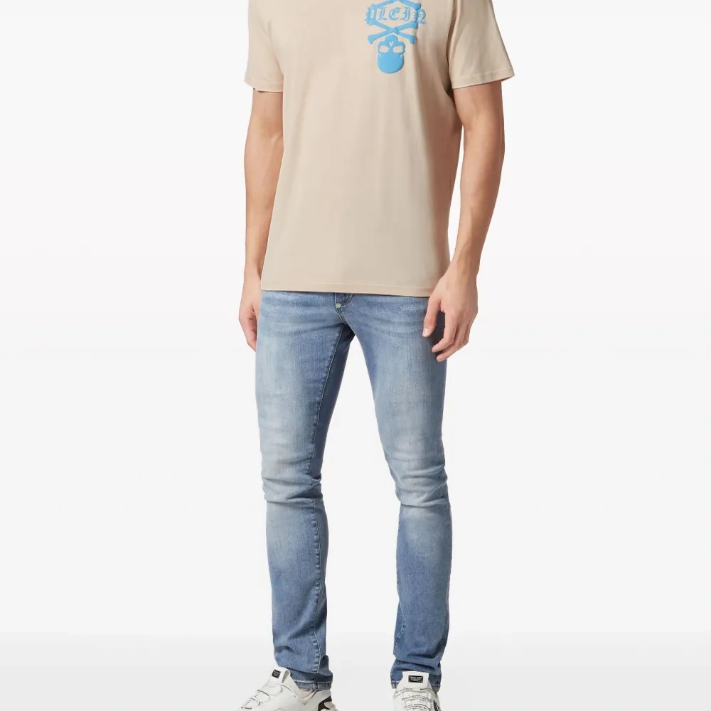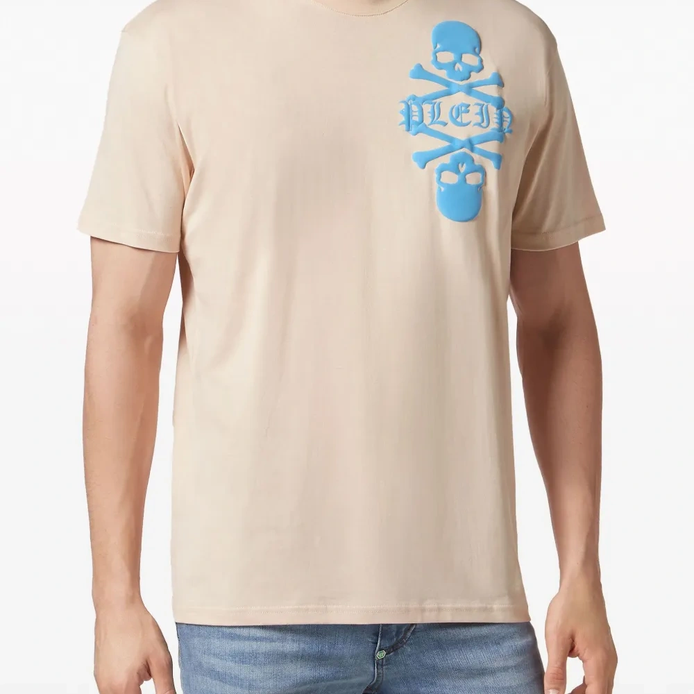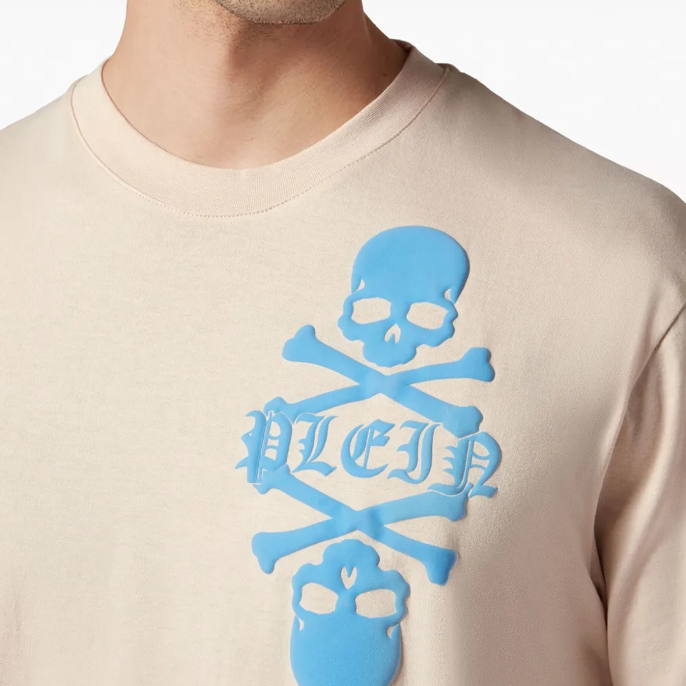Принт с логотипом на груди, принт с изображением черепа спереди, круглый вырез, короткие рукава и прямой подол.