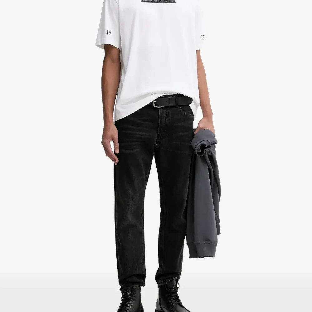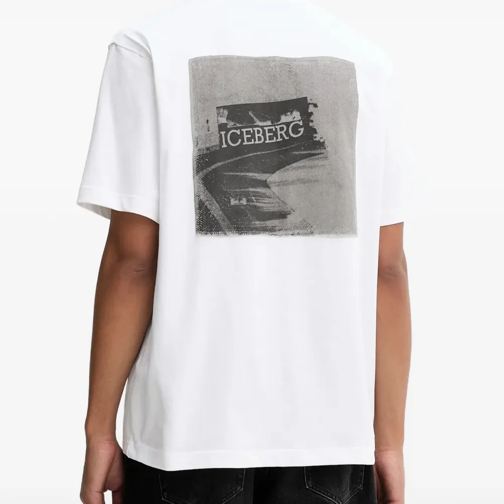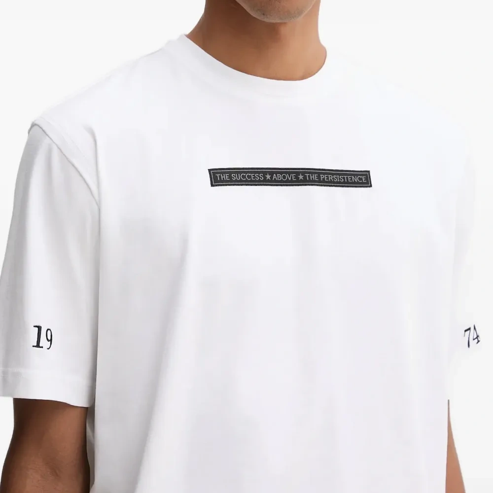белая футболка с графическим принтом на спине, графическим текстовым принтом спереди, принтом с номерами на рукавах, круглый вырез, короткие рукава