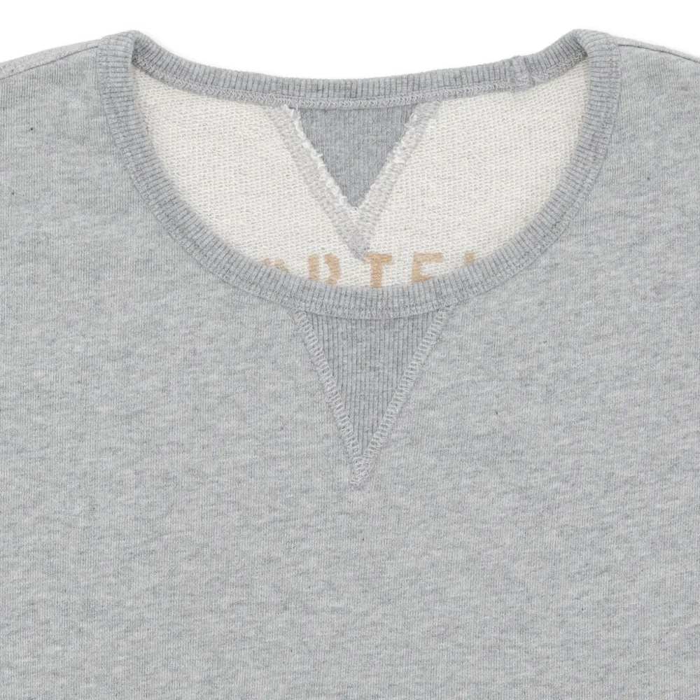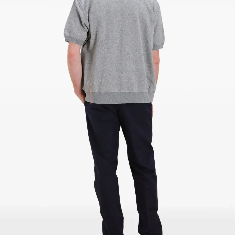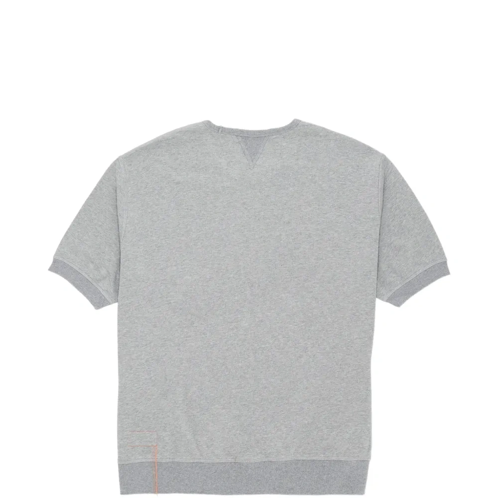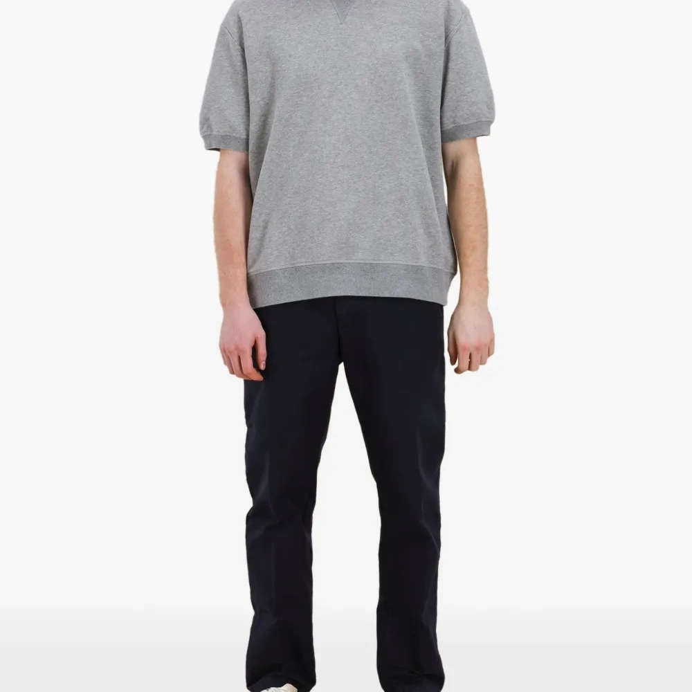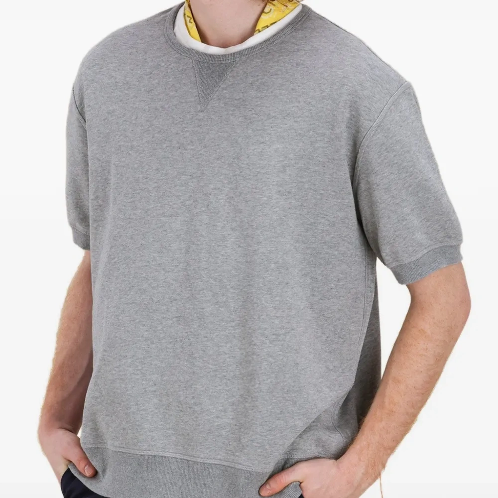 серый цвет, короткие рукава, ребристый край, ребристые манжеты, круглый вырез, V-образная вставка на воротнике