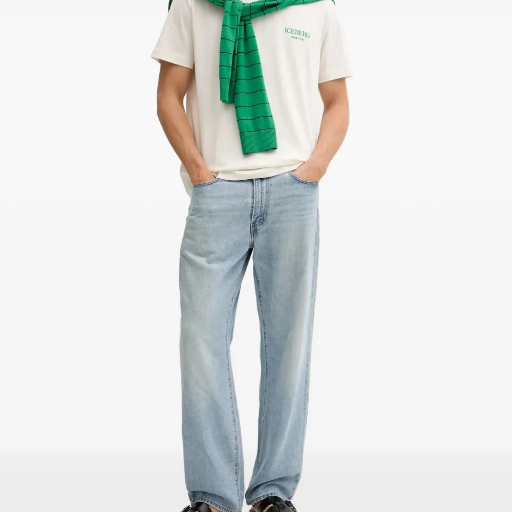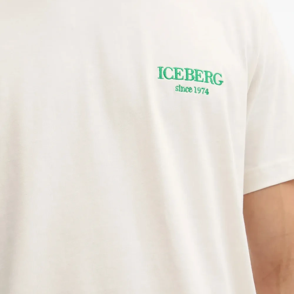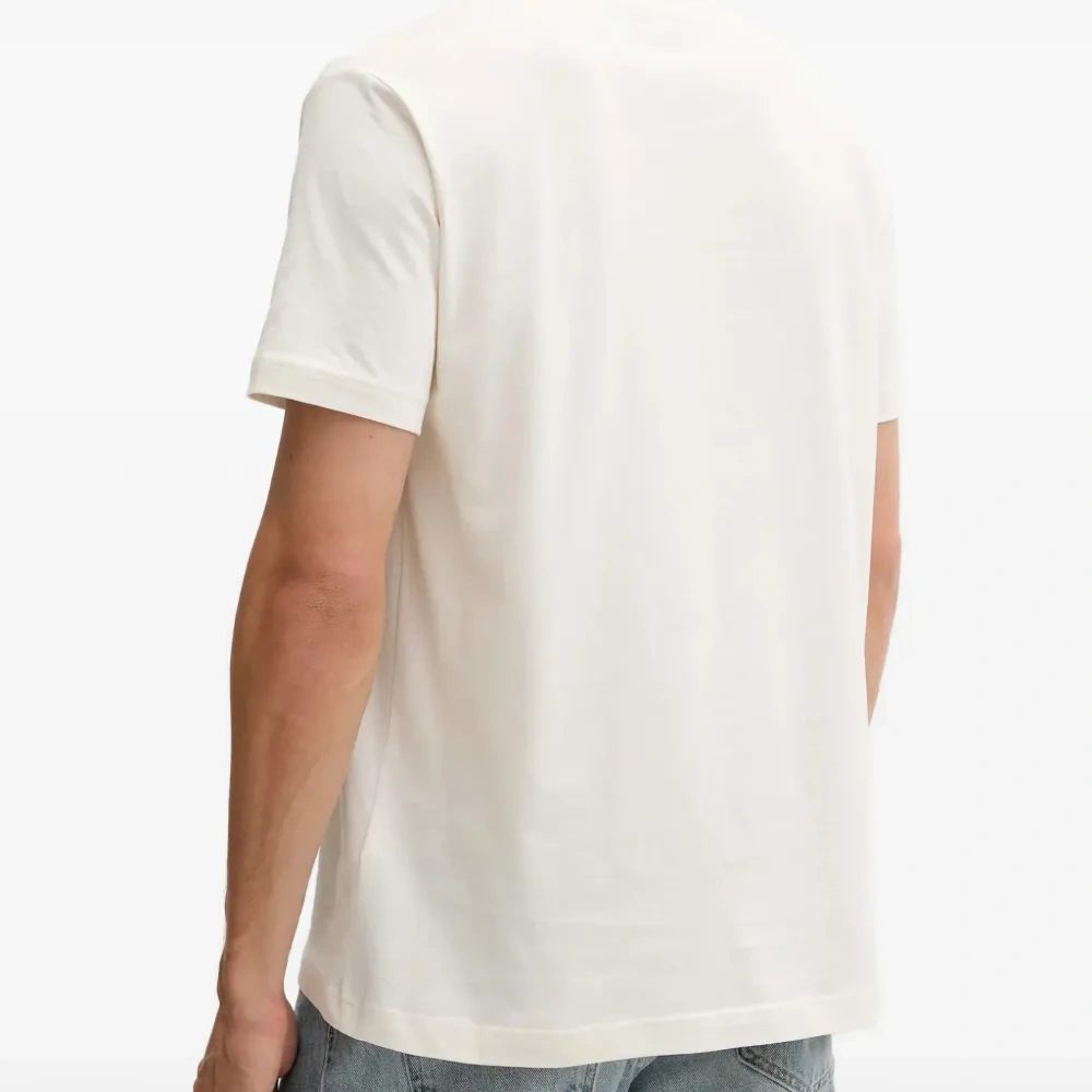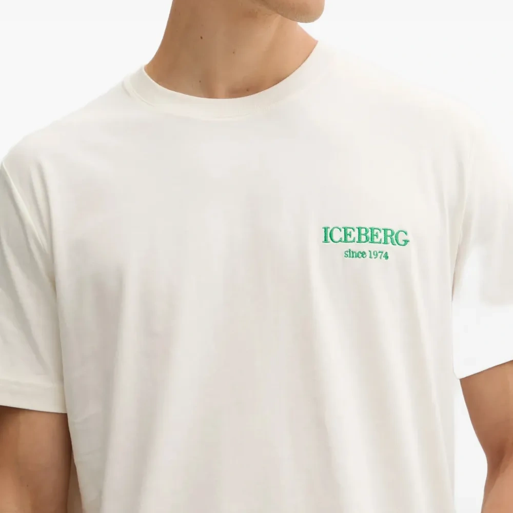белая футболка с круглым вырезом, короткими рукавами и логотипом на груди