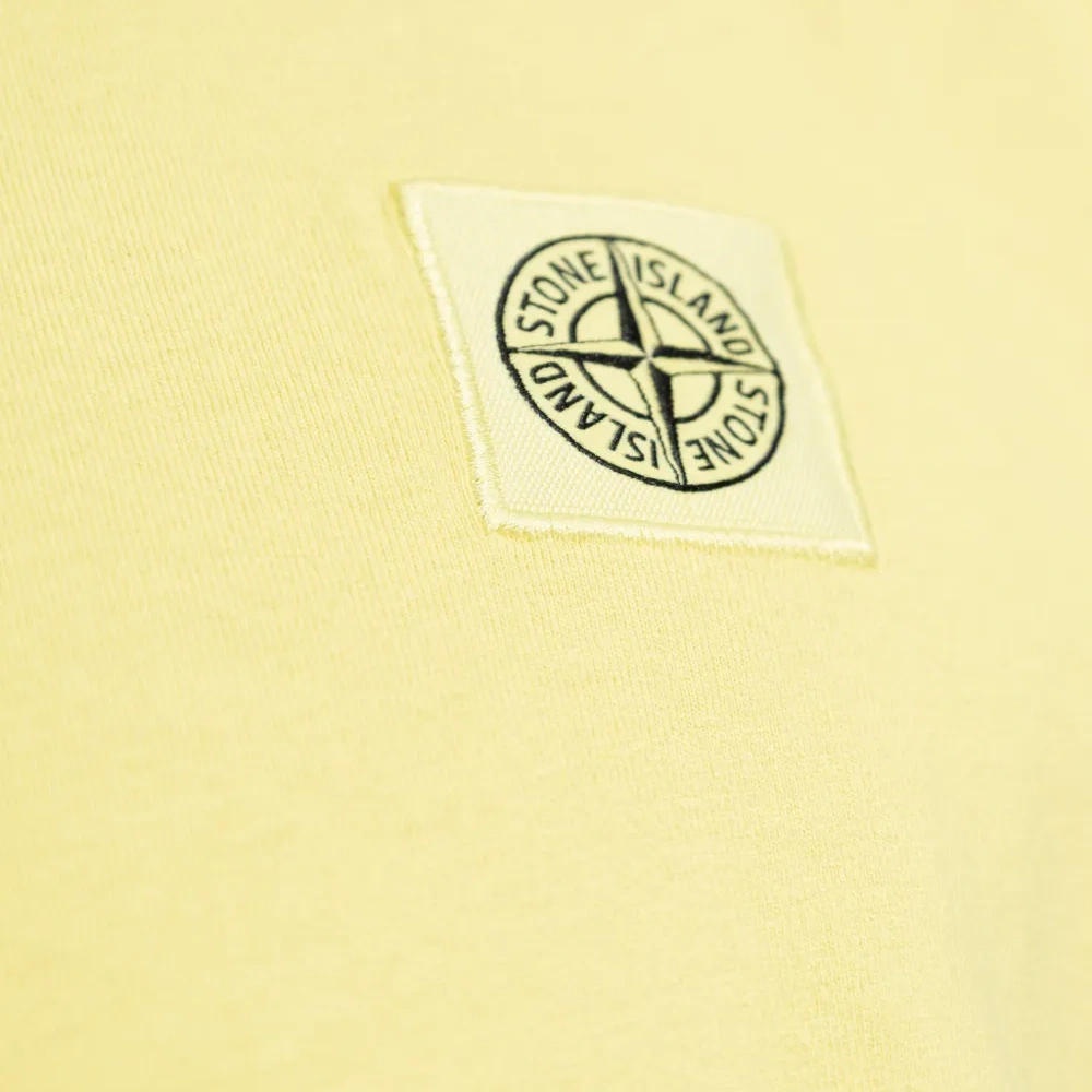 светло-жёлтая футболка с круглым вырезом, короткими рукавами, нашивкой с логотипом и прямым подолом