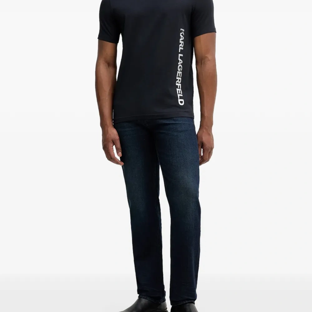 темно-синяя футболка с короткими рукавами, круглым вырезом и логотипом