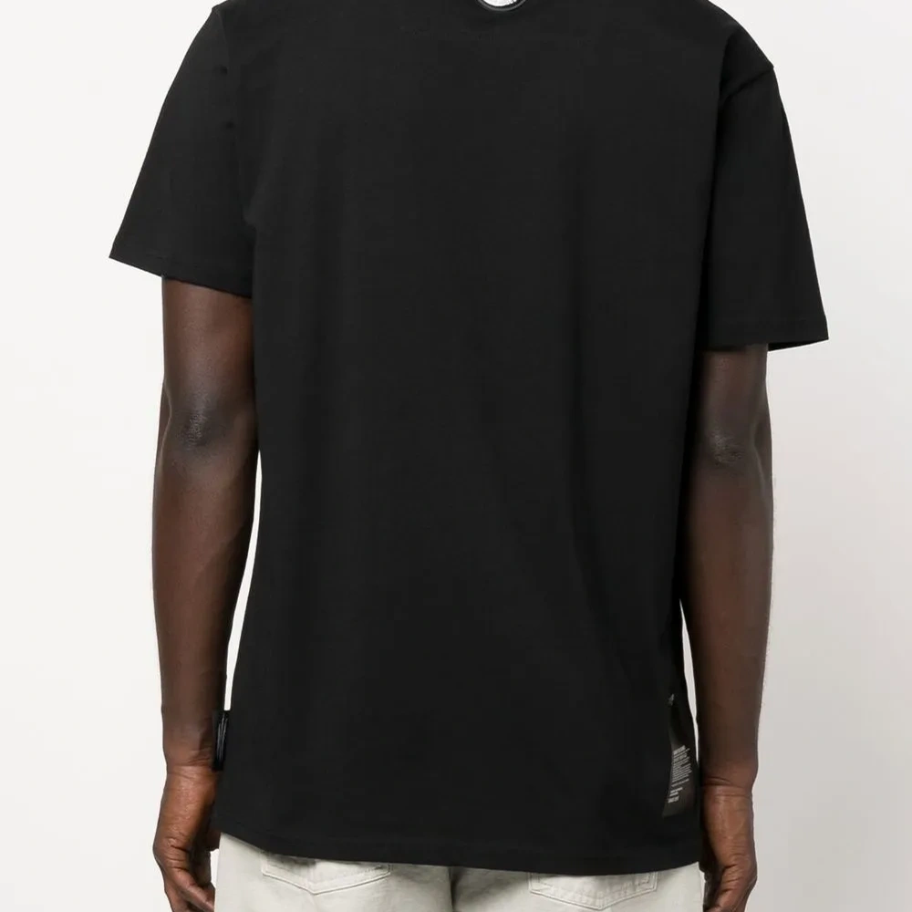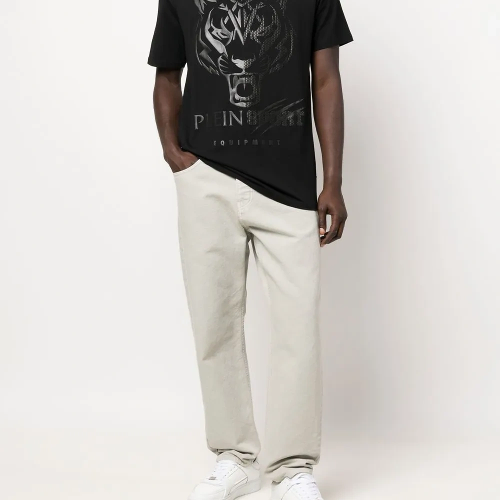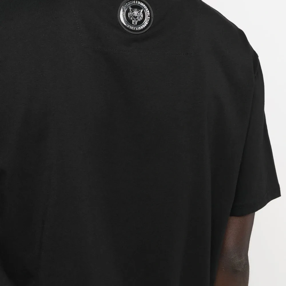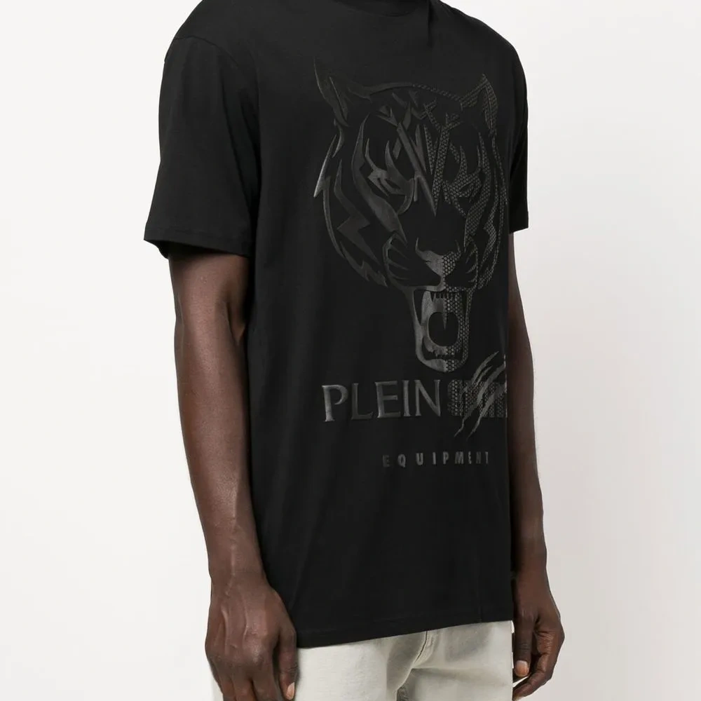 Черный, смесовый хлопок, декор Tiger Head, металлический логотип, круглый вырез, короткие рукава и прямой подол.