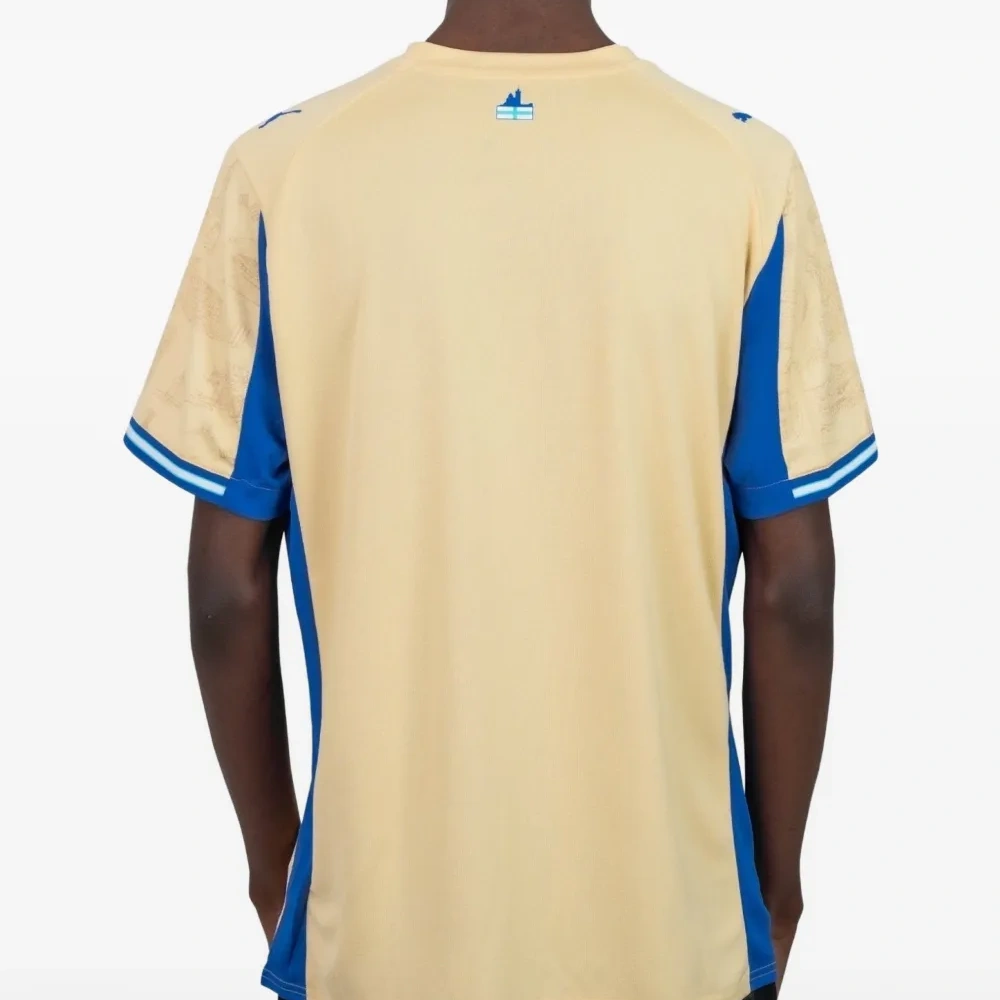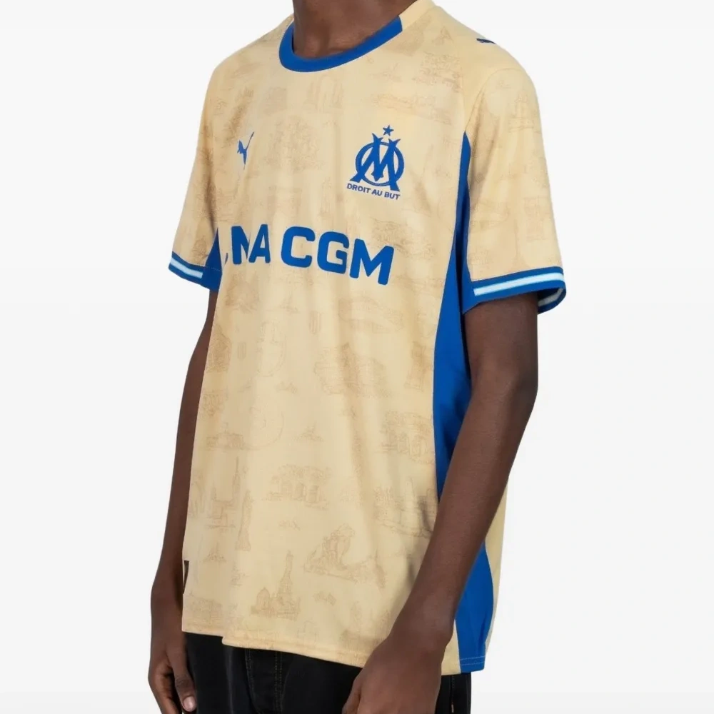 бежевый принтованный дизайн, круглый вырез, короткие рукава, синие отделки, специальная серия