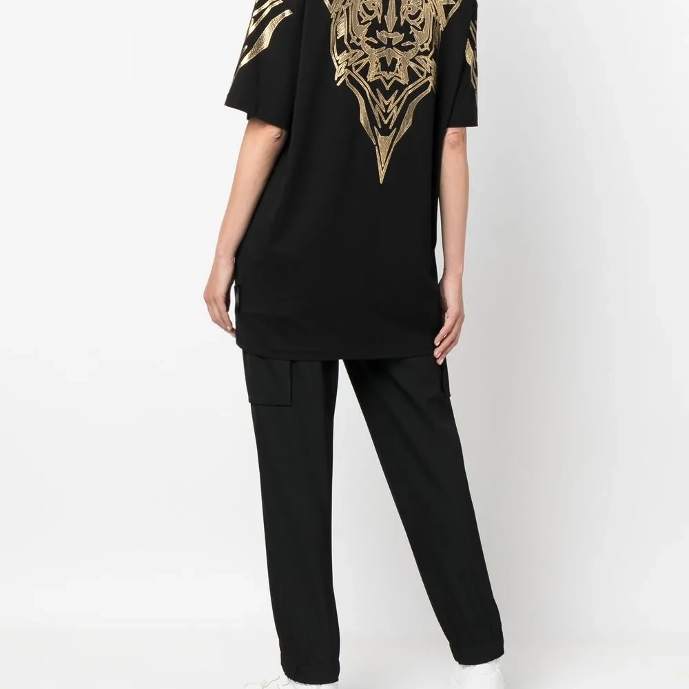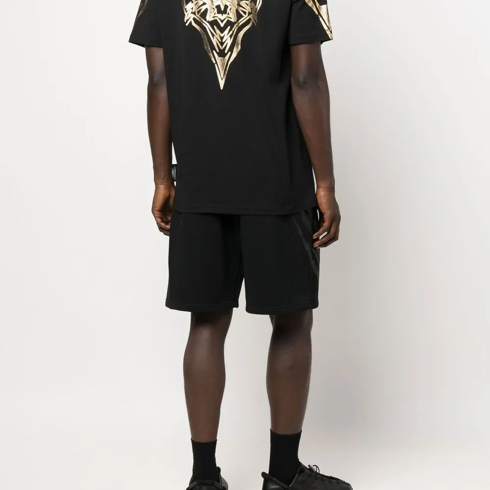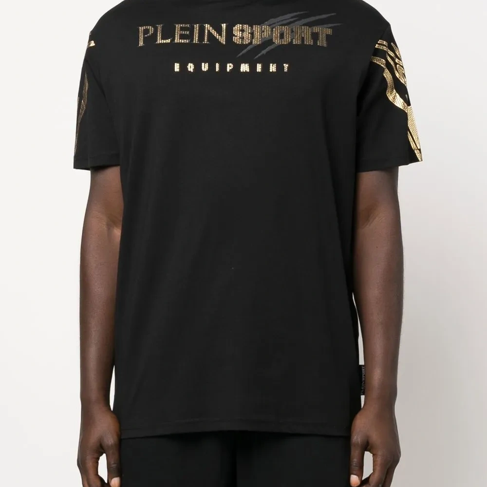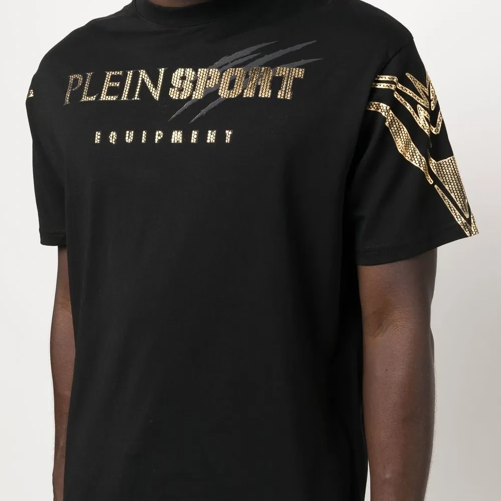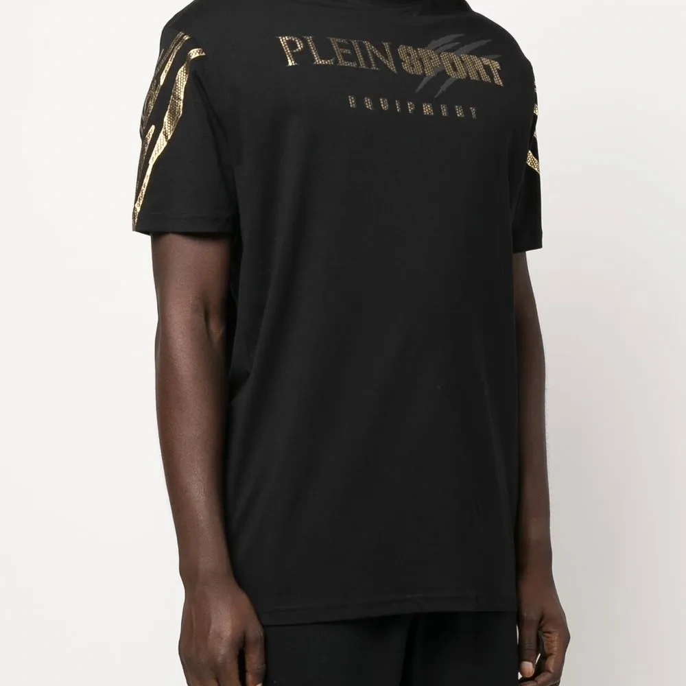 Черный, смесовый хлопок, логотип спереди, круглый вырез и короткие рукава.