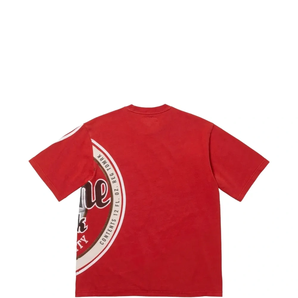 красная футболка с круглым вырезом, короткими рукавами и принтом-логотипом