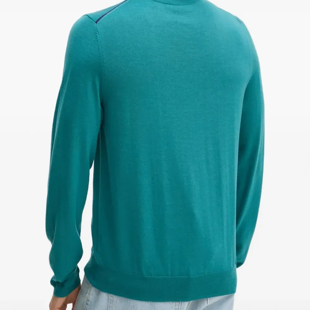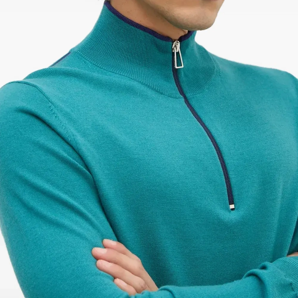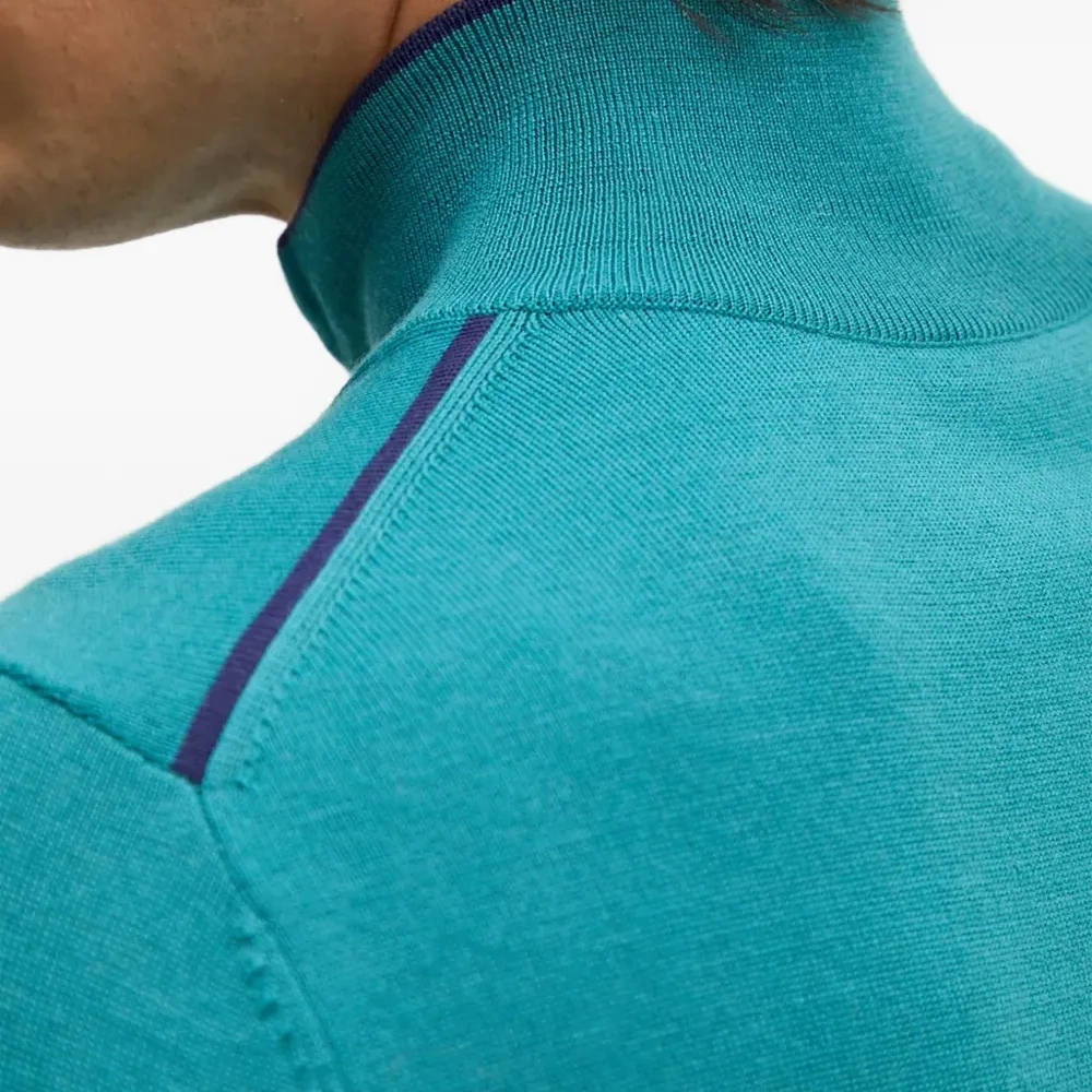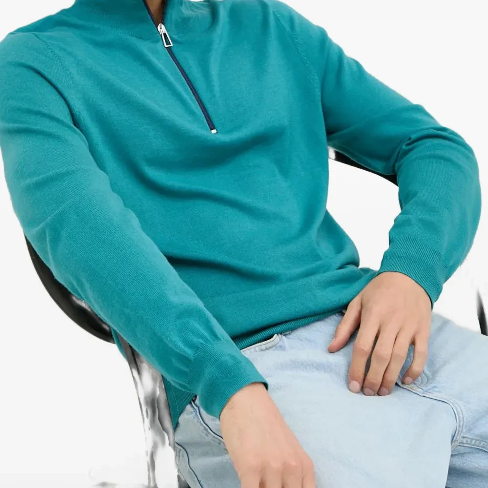 бирюзово-голубой цвет, длинные рукава, тонкий трикотаж, застежка-молния наполовину спереди, высокий воротник, контрастная отделка