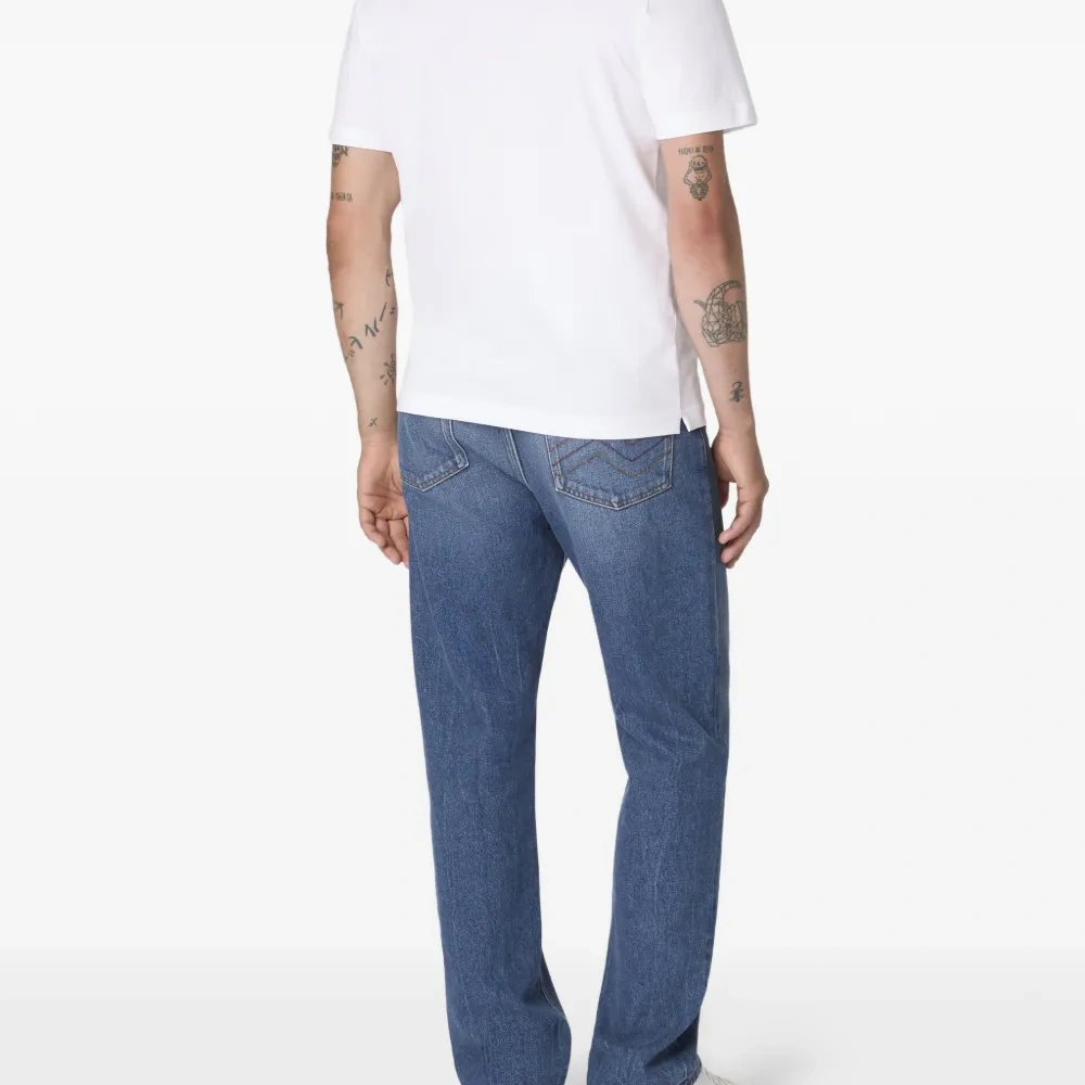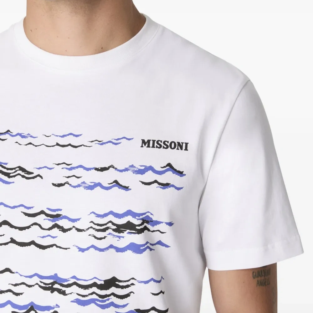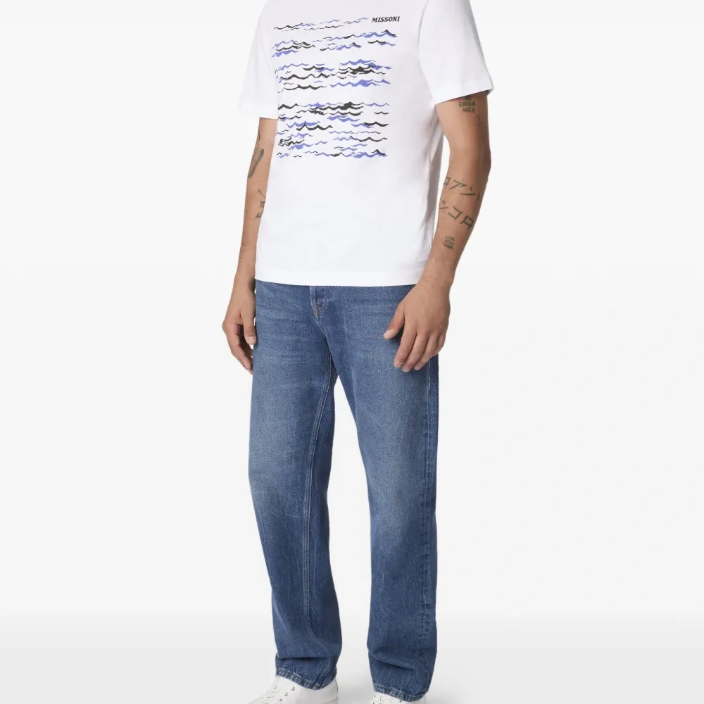 белая футболка с принтом в виде волн, круглый вырез, короткие рукава