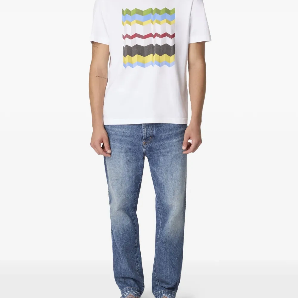 белая футболка с графическим принтом, круглым вырезом и короткими рукавами