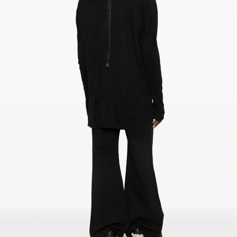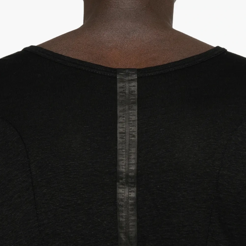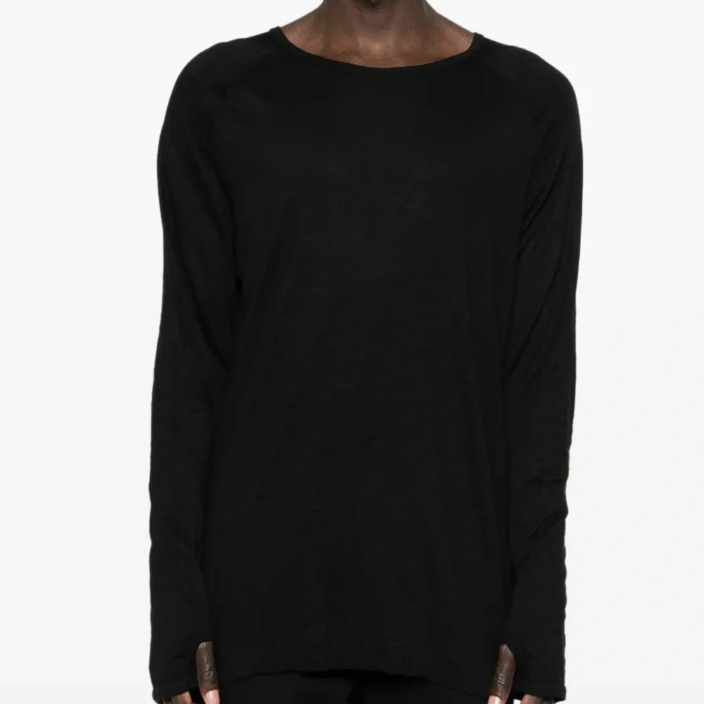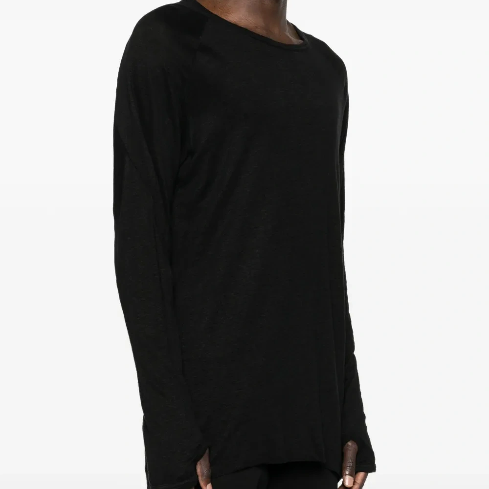 черный топ с длинными рукавами, прорезями для больших пальцев на манжетах, открытыми швами, необработанным краем и круглым вырезом