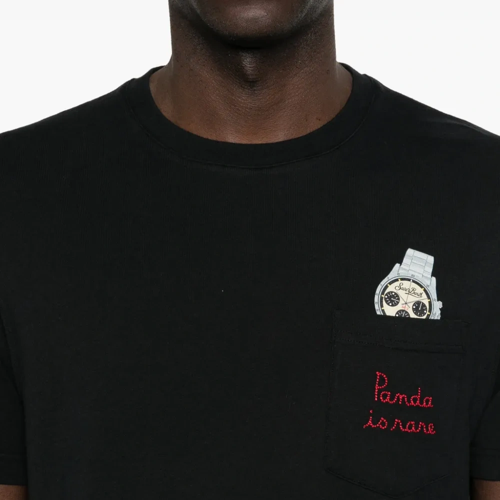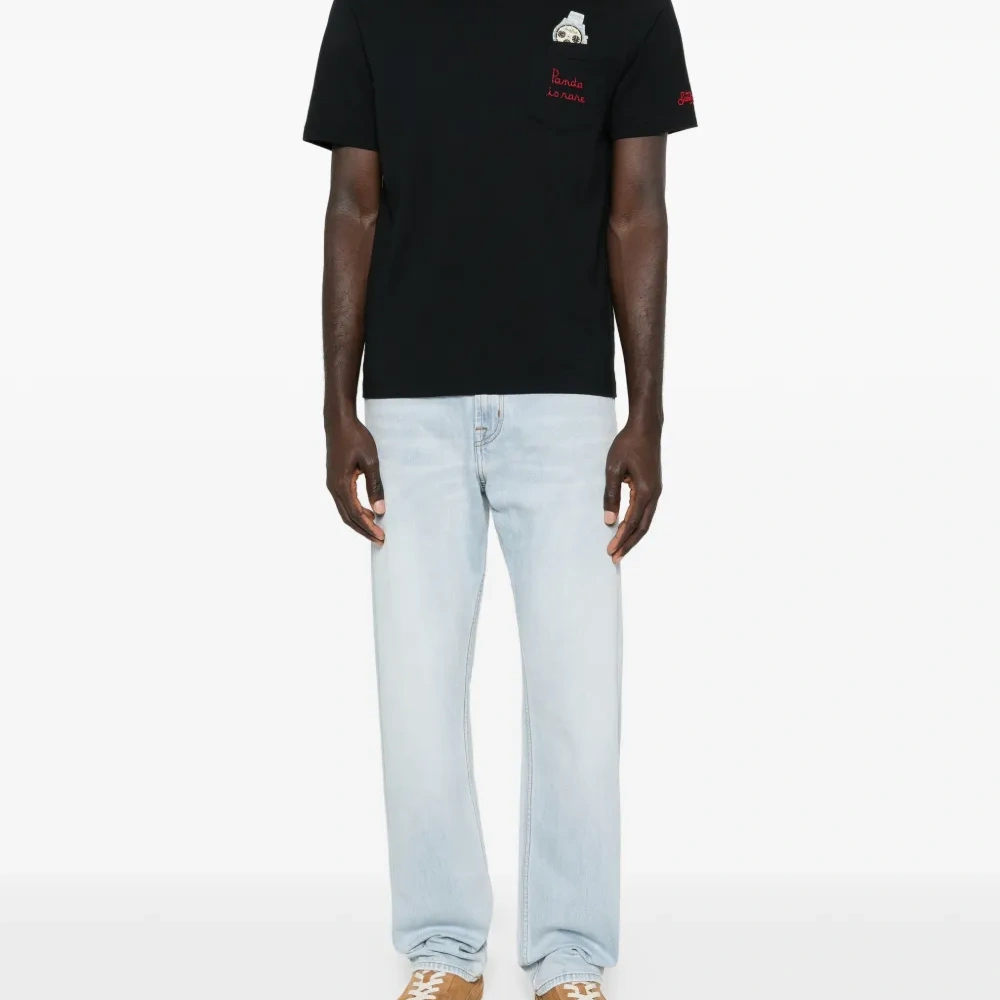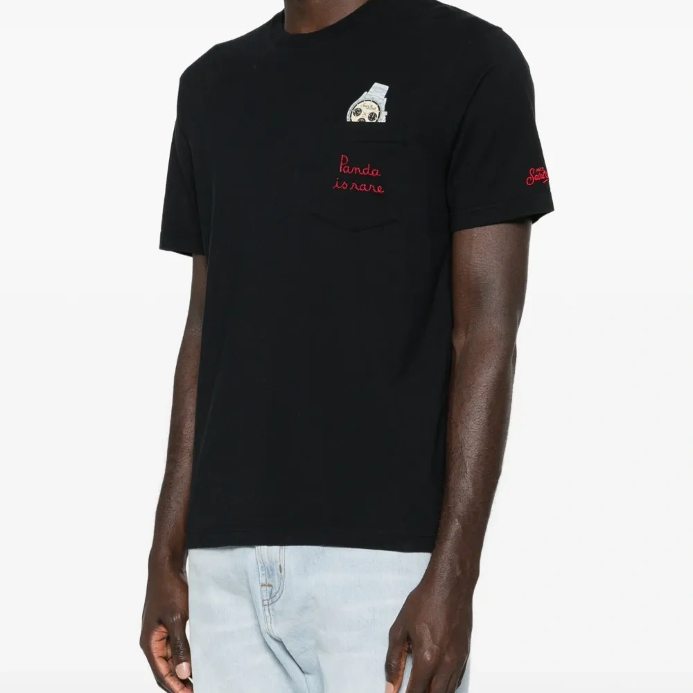 чёрная футболка с нашивным карманом на груди, вышивкой "Panda Is Rare", круглый вырез, короткие рукава