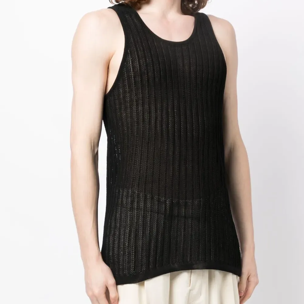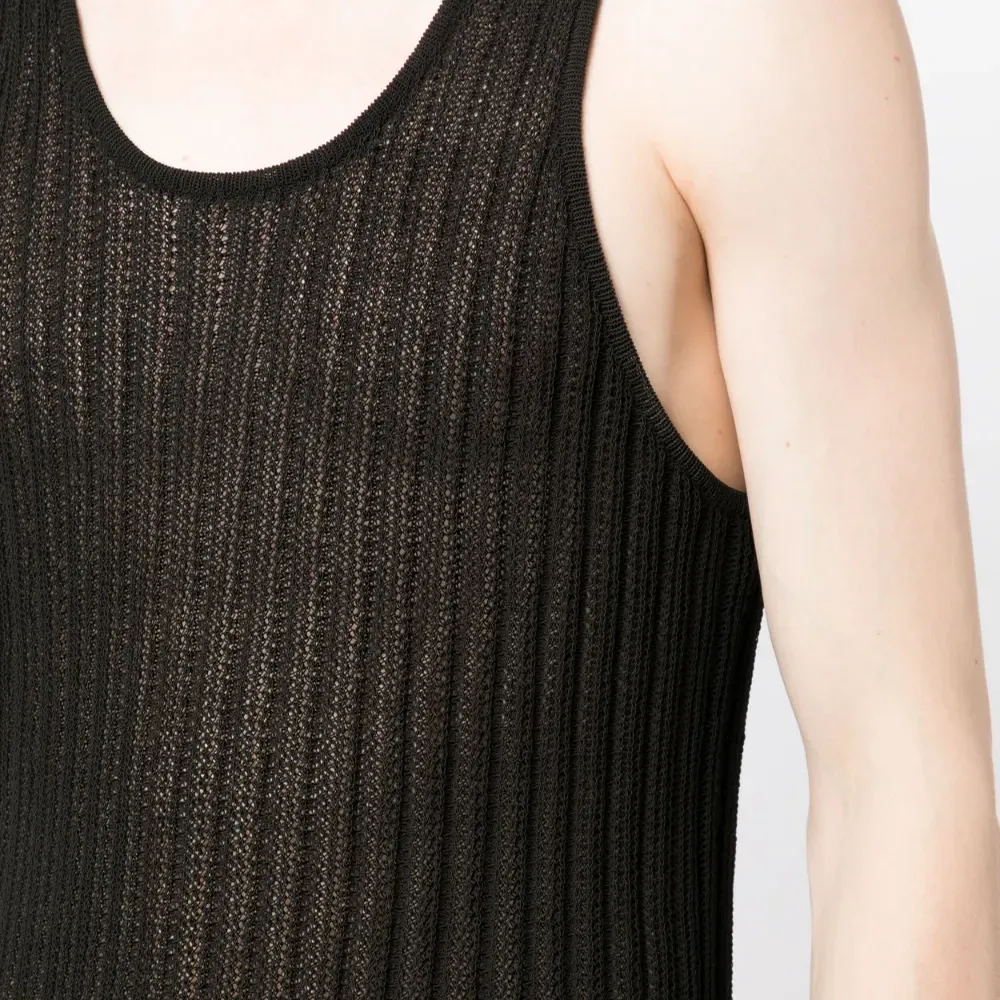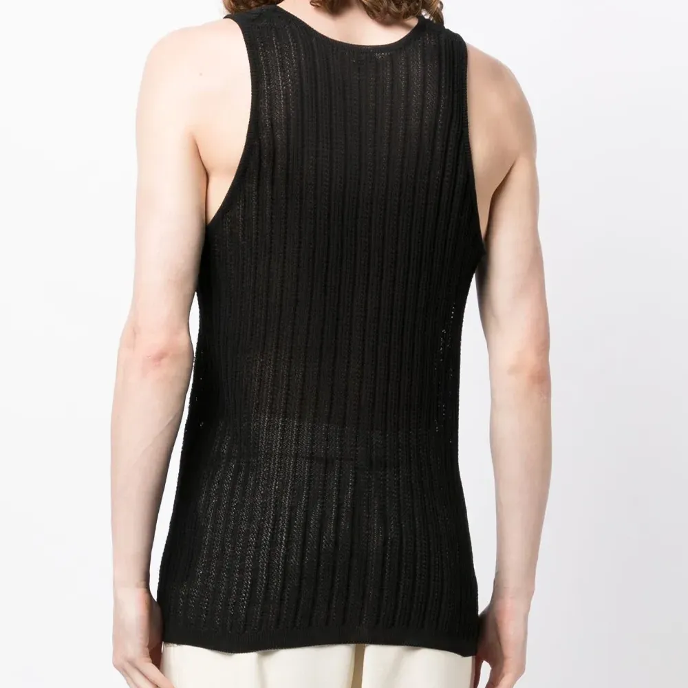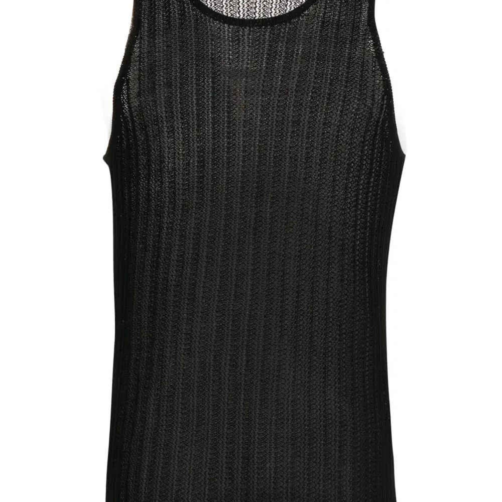 Черный, смесовый хлопок, трикотажный материал, U-образный вырез, без рукавов и прямой подол. Узнать больше о том, какие товары получают отметку «Ответственный выбор», можно из материала «Как мы оцениваем экологичность и этичность».