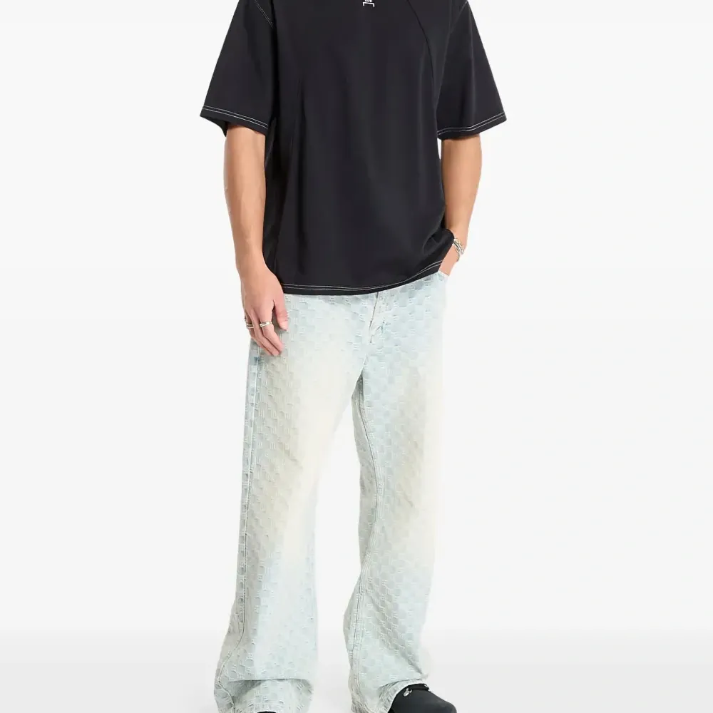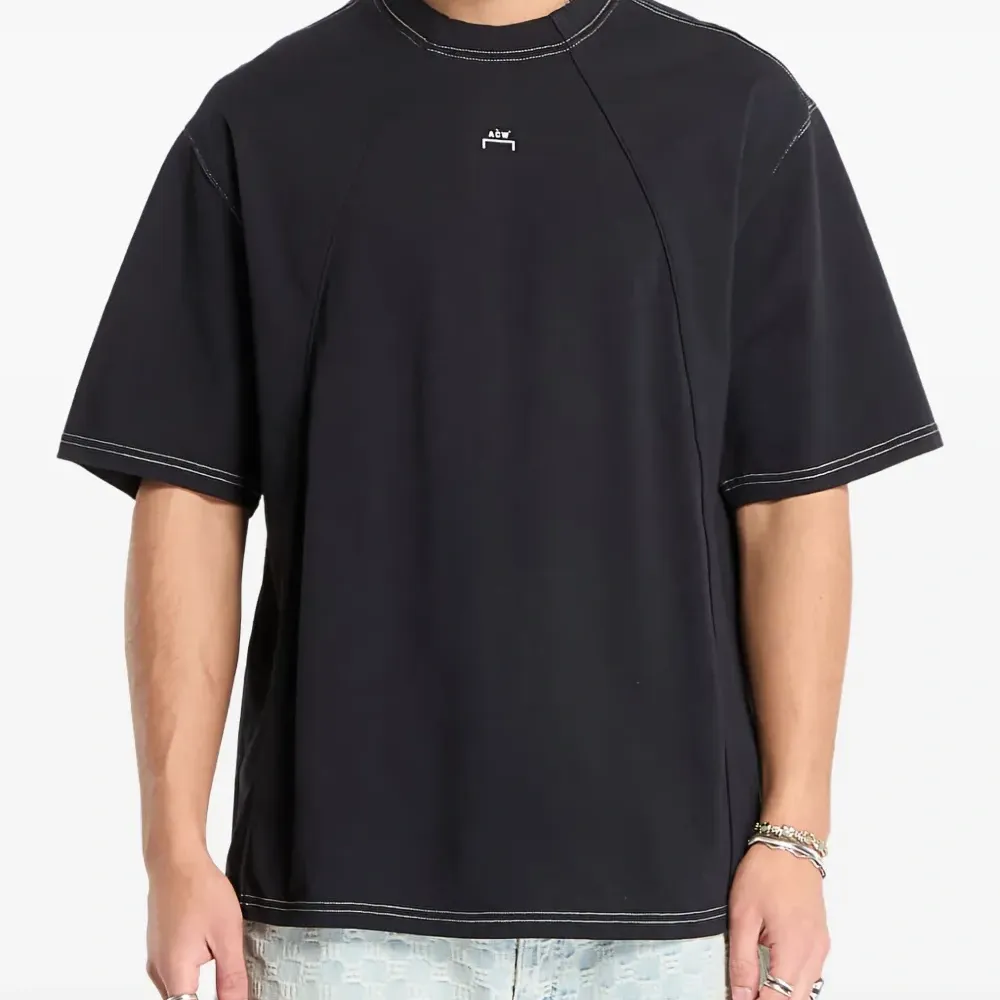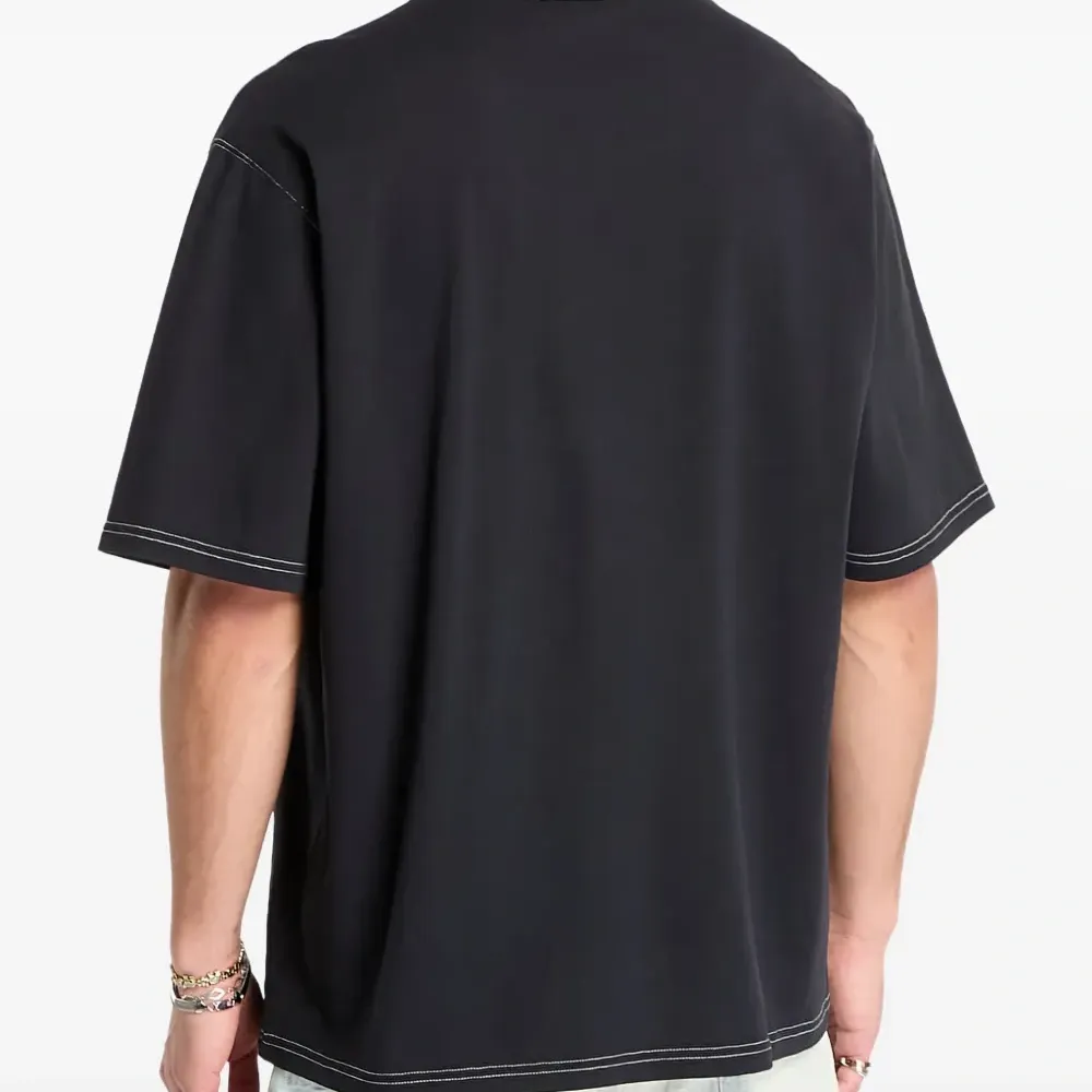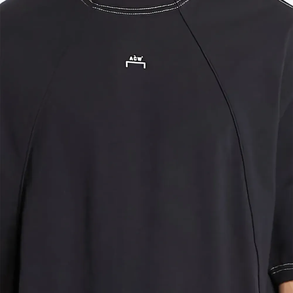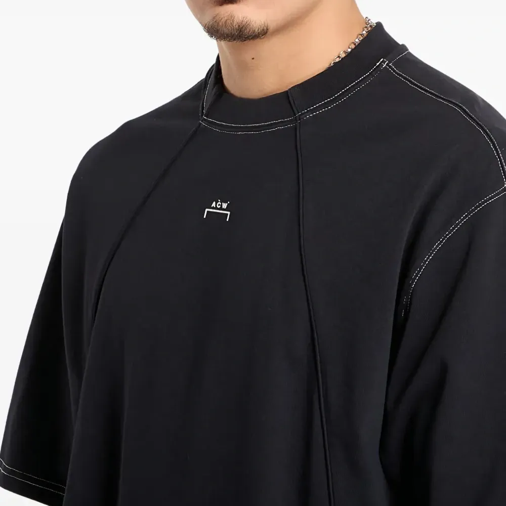 черная футболка с простроченными деталями, логотипом, короткими рукавами и круглым вырезом