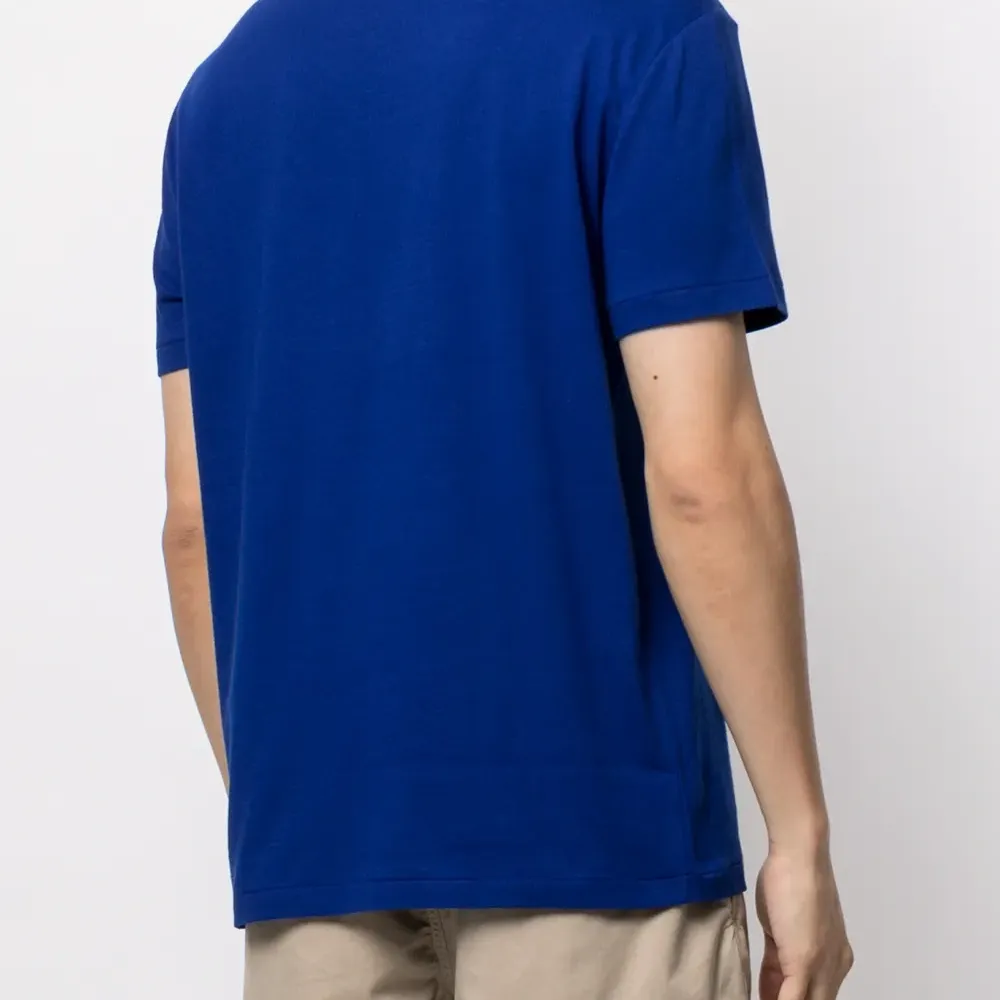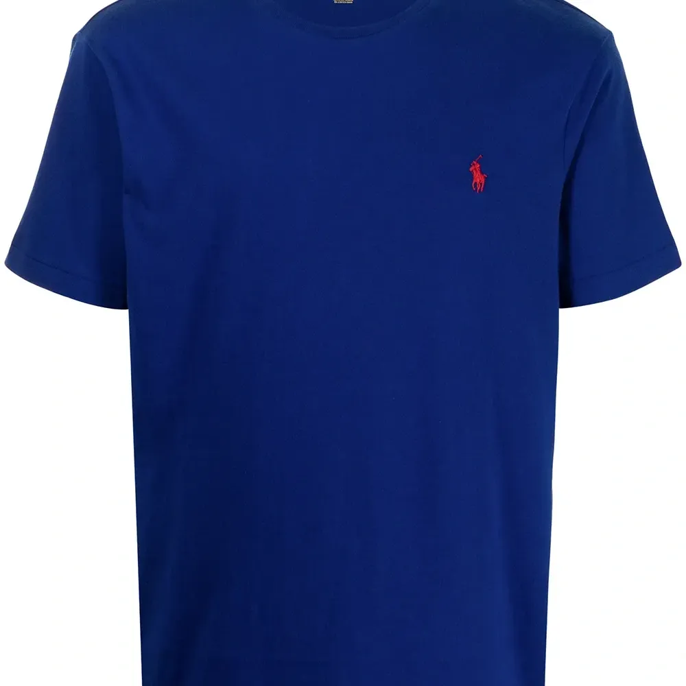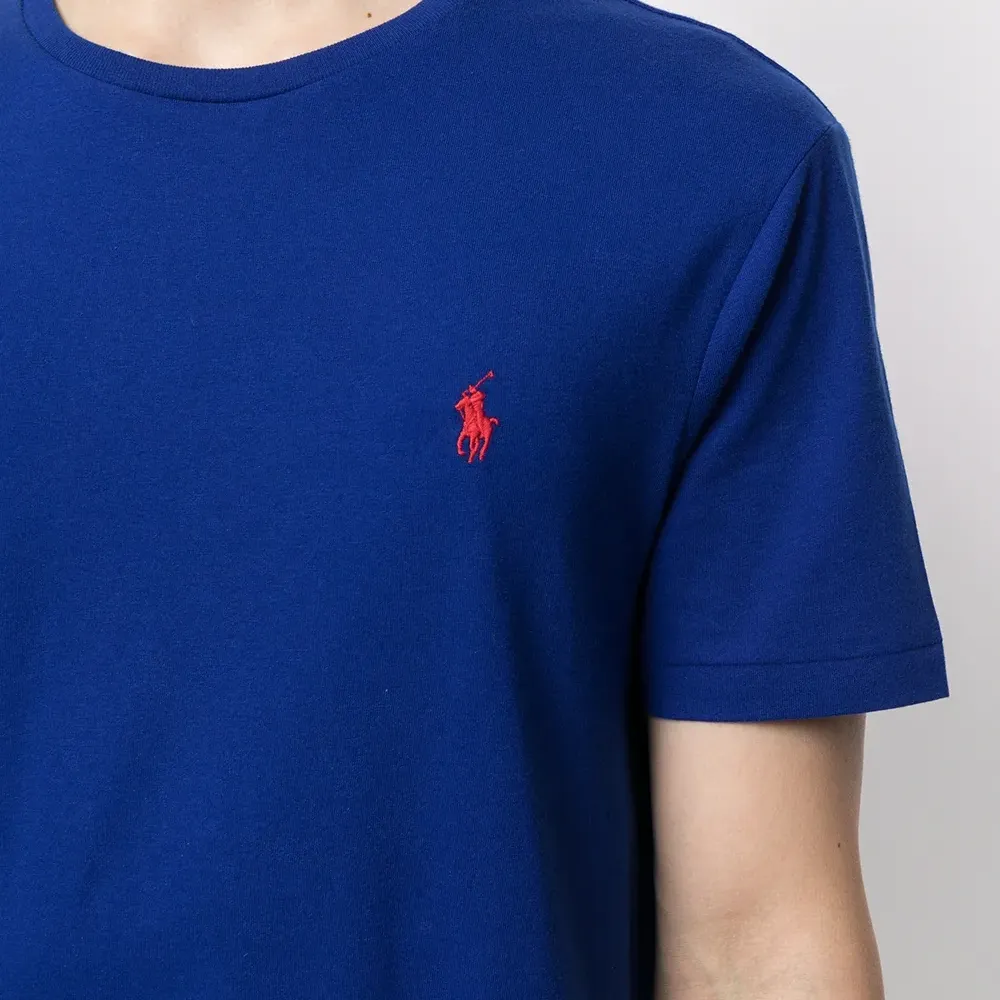 Вышитый логотип на груди, круглый вырез и короткие рукава.