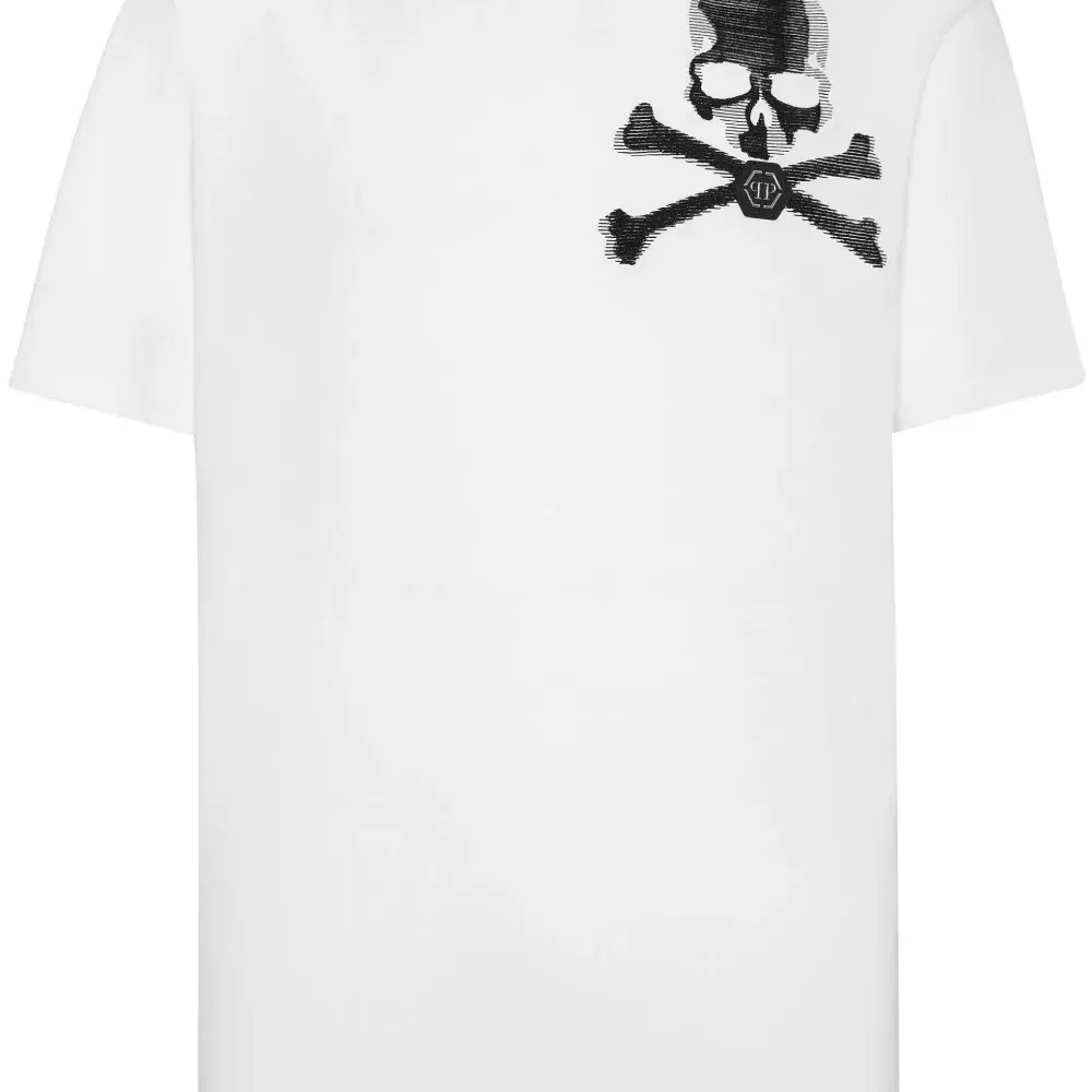 Белый, хлопок, принт с изображением черепа спереди, украшения из горного хрусталя, круглый вырез, короткие рукава и прямой подол.
