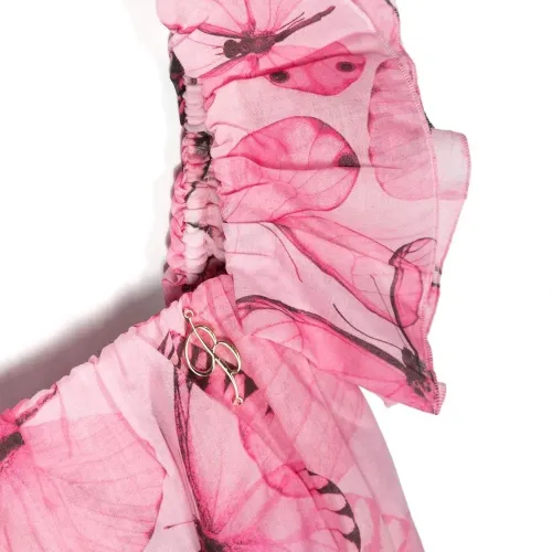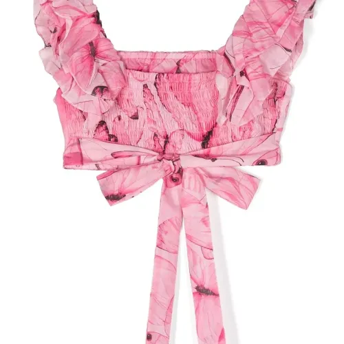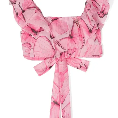 Розовый, хлопок, принт с изображением бабочки, вставка со сборками, укороченная длина, квадратный вырез, застежка на завязке сзади и расклешенные рукава.