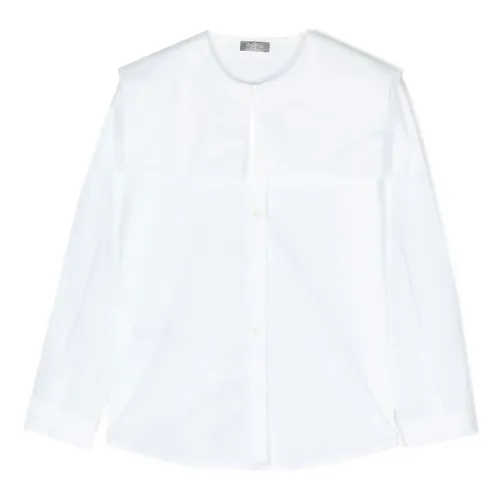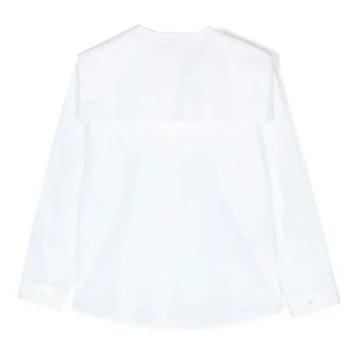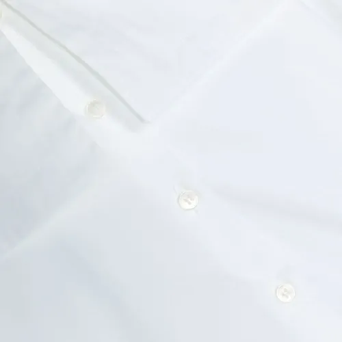 Белый, смесовый хлопок, длинные рукава, застежка на пуговицах спереди и манишка.