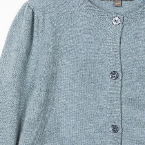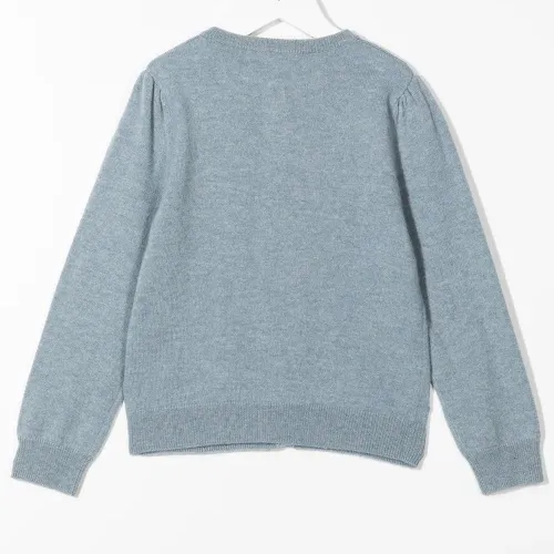 Тонкая вязка, застежка на пуговицах спереди, манжеты в рубчик, подол в рубчик, длинные рукава и круглый вырез. Цвет: синий. .