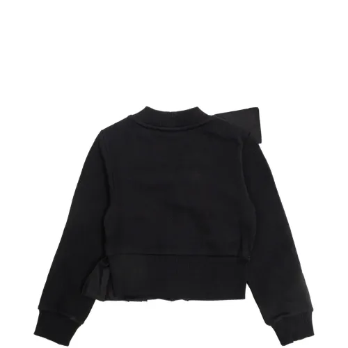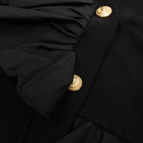 черный цвет, V-образный вырез, застежка на пуговицы спереди, отделка оборками, деталь с логотипом