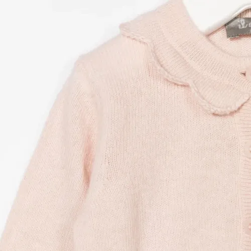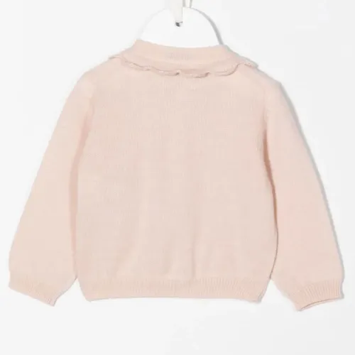 Светло-розовый, шерсть мериноса, вставки с оборками, застежка на пуговицы и длинные рукава.
