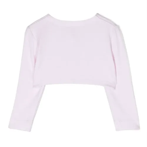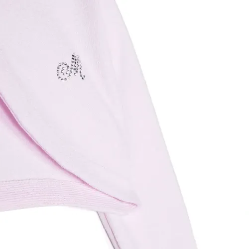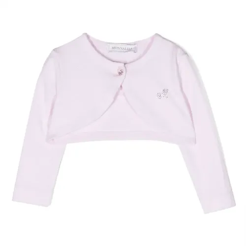Розовый, укороченная длина, украшения из горного хрусталя, пуговицы в форме сердца, круглый вырез, застежка на пуговицах спереди и длинные рукава.