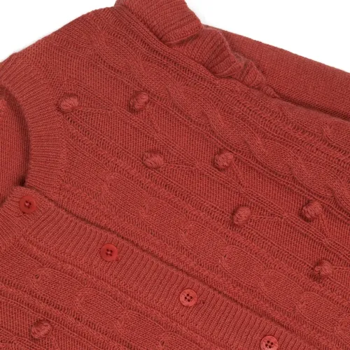 Темно-оранжевый, необработанная шерсть, фактурная вязка, вставки с оборками, помпоны, круглый вырез, длинные рукава, застежка на пуговицах спереди и прямой подол.
