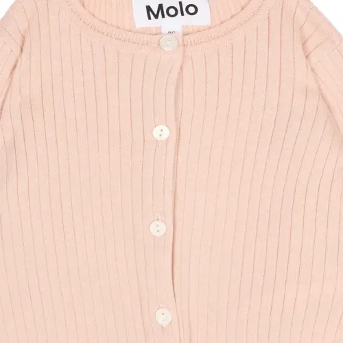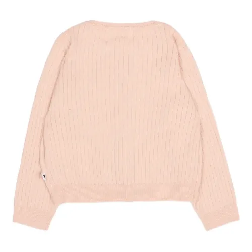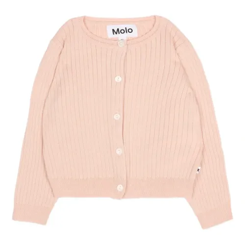 розовая вязаная в рубчик кофта на пуговицах с круглым вырезом и длинными рукавами