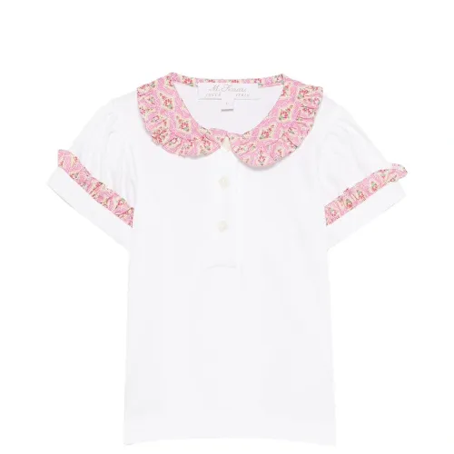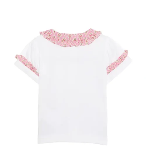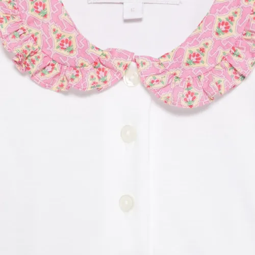 белое и розовое платье с цветочным принтом, оборчатым воротником, короткими рукавами и застежкой на пуговицы