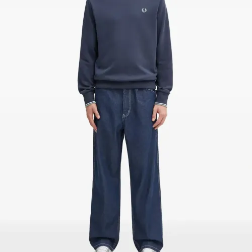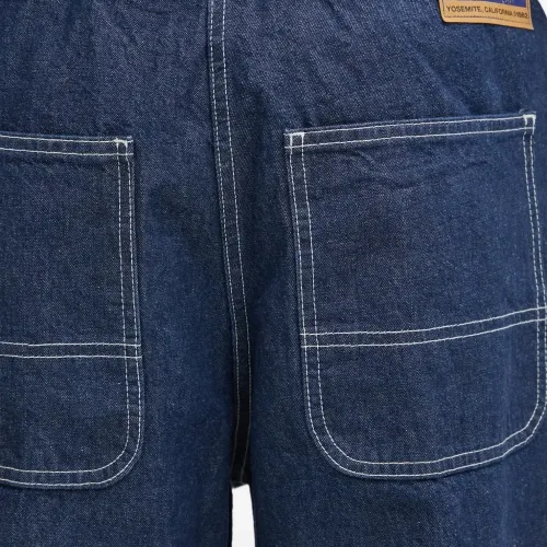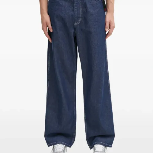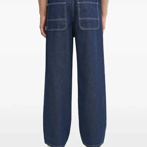 промытый индиго, ремень, эластичный пояс, контрастная строчка, накладной задний карман, широкая штанина