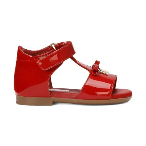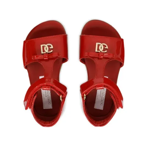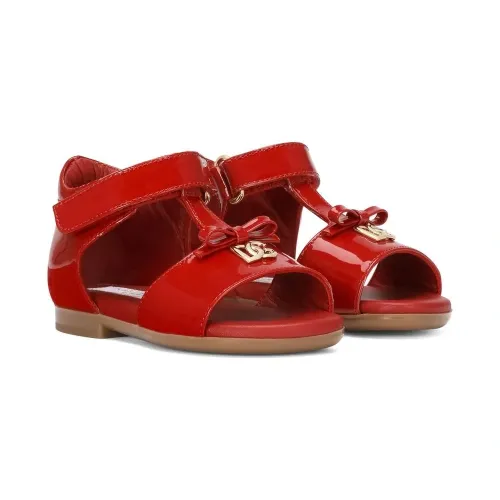 Красный, телячья кожа, лакированная отделка, золотистый металлический логотип, бант, застежка на липучке спереди, Т-образный ремешок, открытый носок, кожаная стелька с логотипом и плоская резиновая подошва.