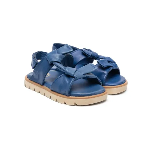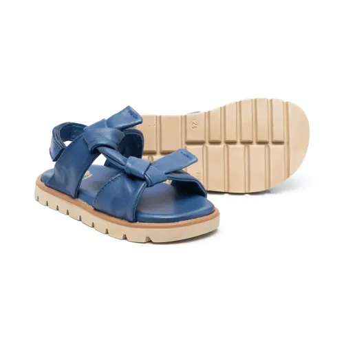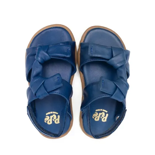 Кобальтово-синий, телячья кожа, козья кожа, декор в виде узла, несколько вариантов крепления бретелей, открытый носок, застежка на липучке спереди, ремешок на пятке, кожаная стелька с логотипом и рифленая резиновая подошва.