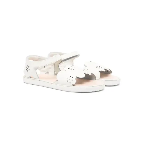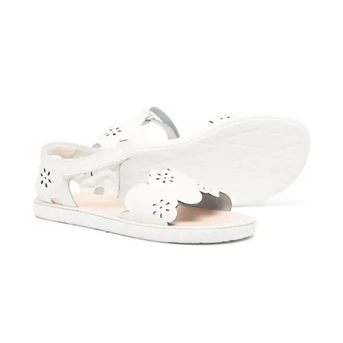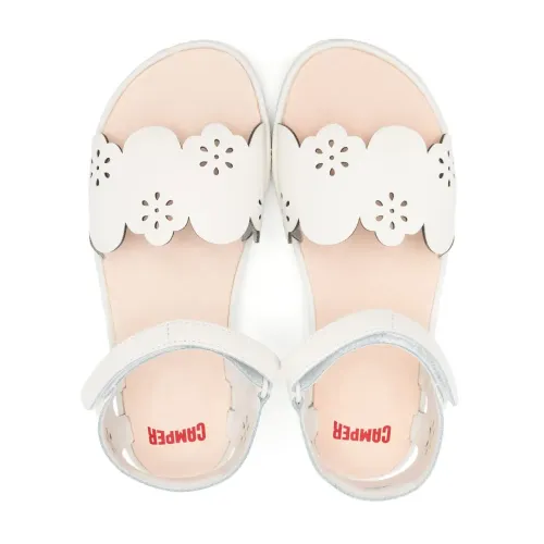 Белый, телячья кожа, цветочный узор, перфорация, закругленный носок, открытый носок, застежка на липучке сбоку, кожаная стелька с логотипом и плоская резиновая подошва.