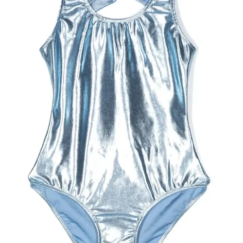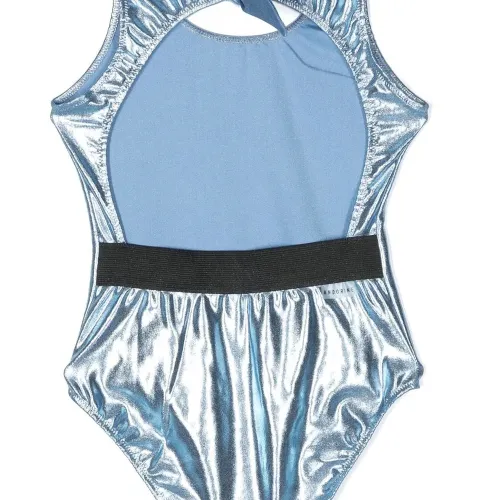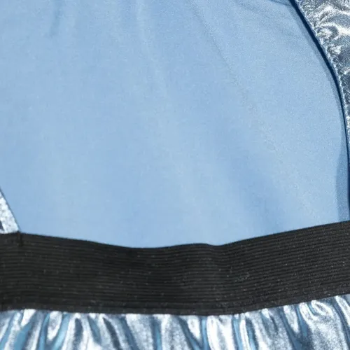 Голубой, серебристый, эффект металлик, глянцевая фактура, открытая спина и застежка на завязке сзади. . Узнать больше о том, какие товары получают отметку «Ответственный выбор», можно из материала «Как мы оцениваем экологичность и этичность».