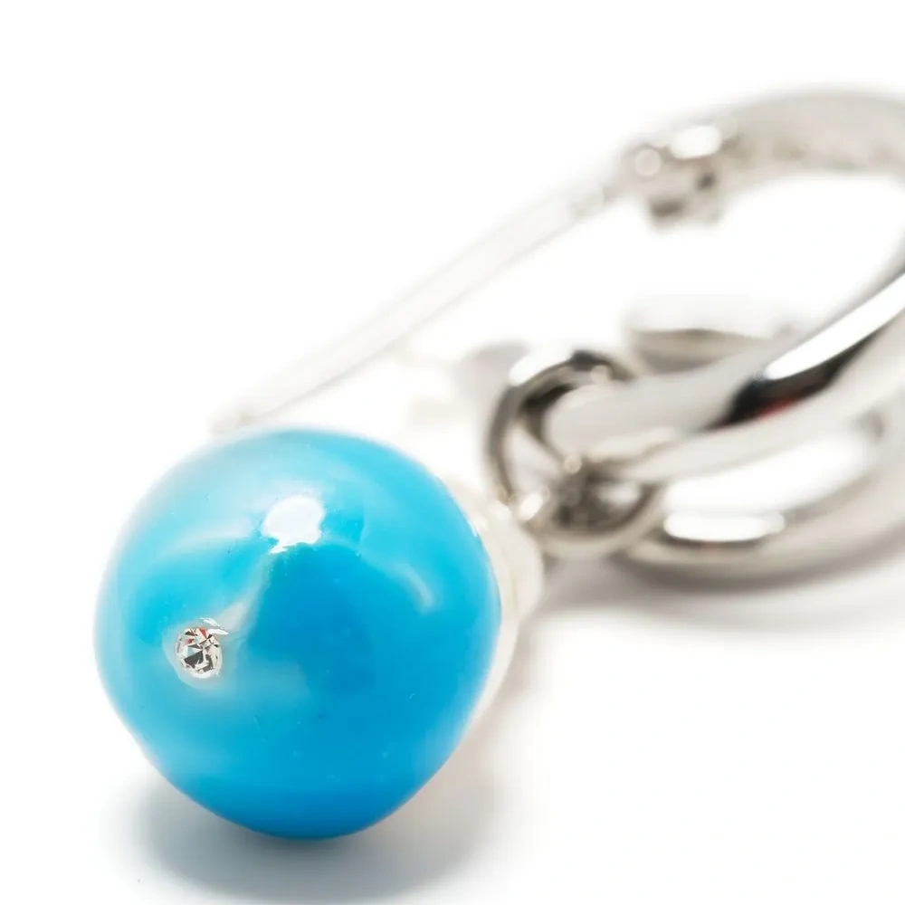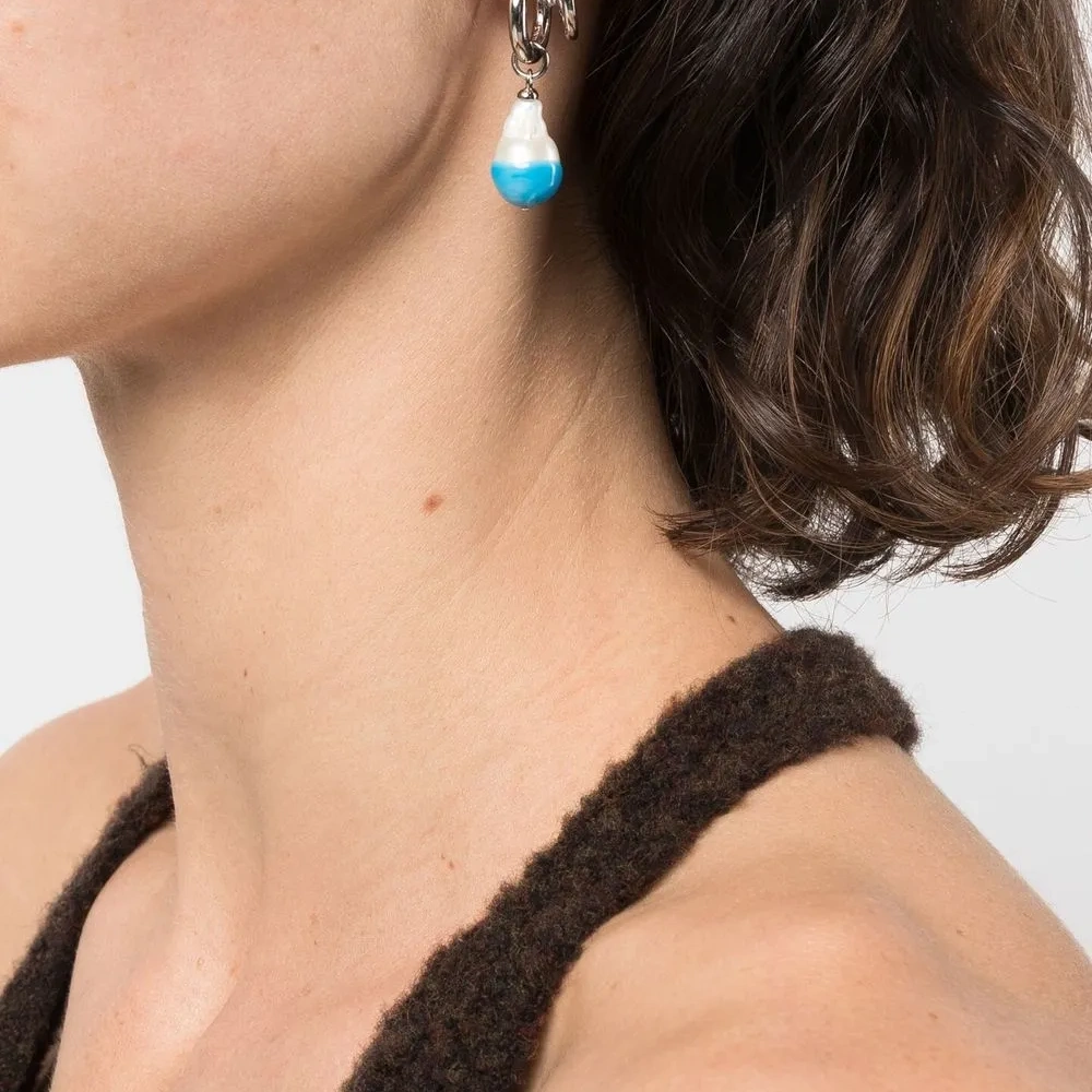 Булавочная застежка, кольца скульптурной формы, детали с жемчугом и для проколотых ушей. В комплект входят две серьги.