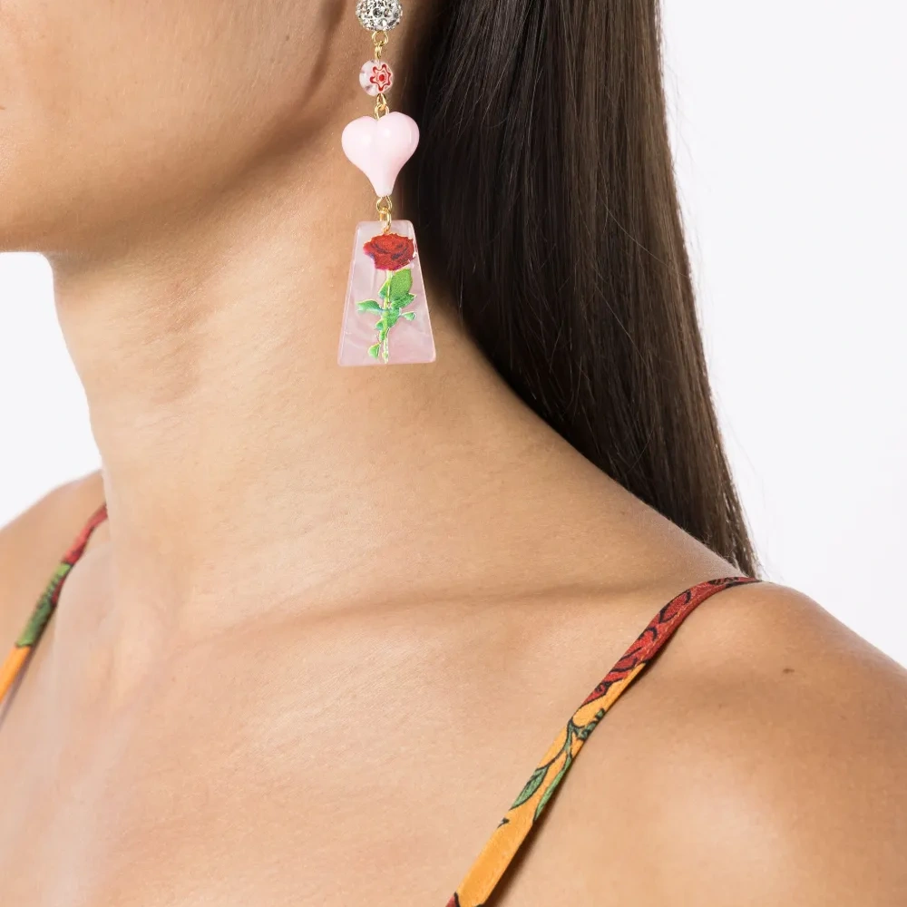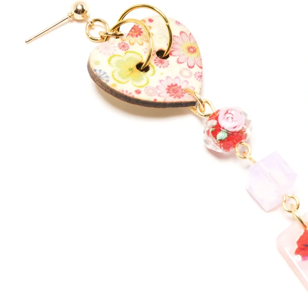 Асимметричная форма, декор из кристаллов, декор из бисера, цветочный принт, подвеска в форме сердца и застежка-штифт. В комплект входят две серьги.