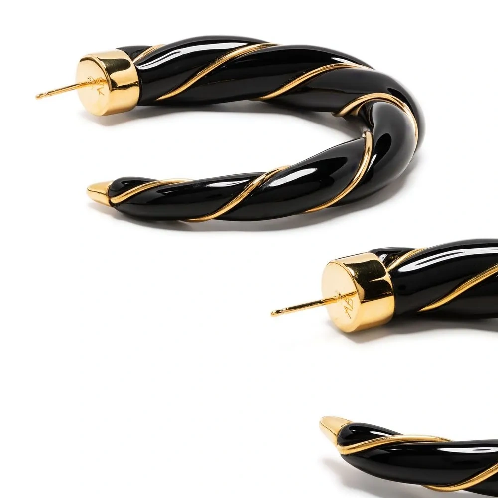 Черный, золотистый, перекрученная деталь, полукруглая форма и застежка на кнопках. В комплект входят две серьги.