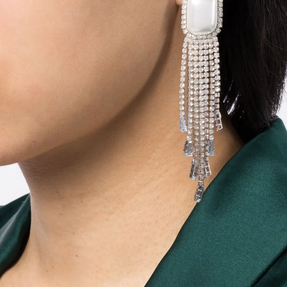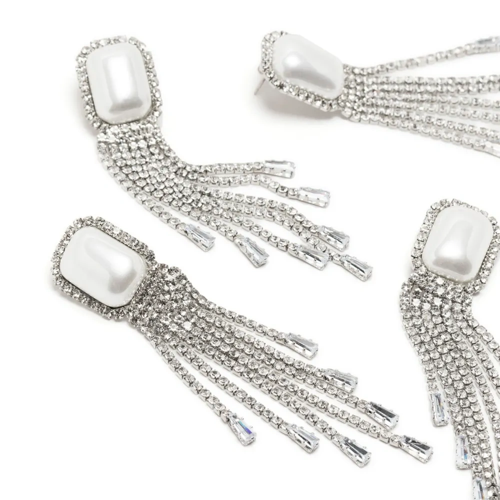 Серебристый, серебро, серьги-подвески, жемчужная деталь, декор из кристаллов, застежка-штифт и для проколотых ушей. Продаются попарно.