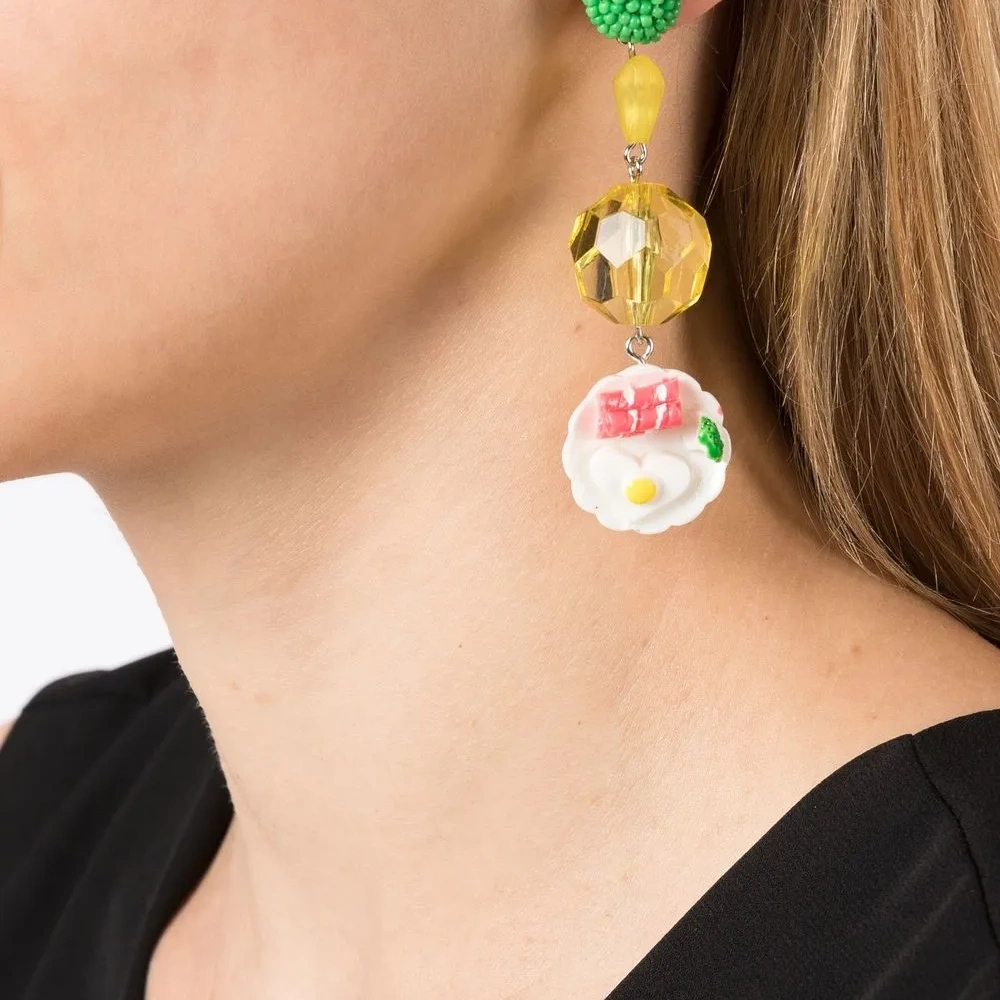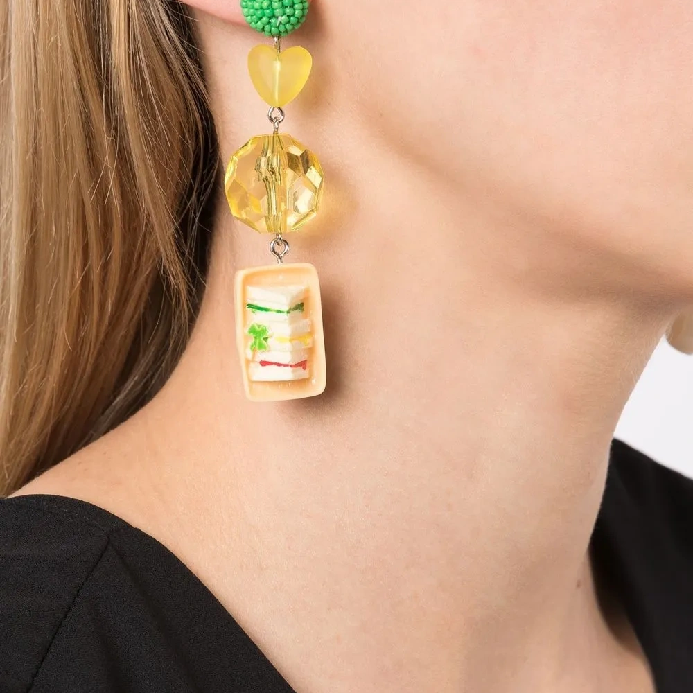 Разноцветный, металл, детали из бисера и застежка-бабочка. Правая и левая серьга различаются — это часть дизайна.