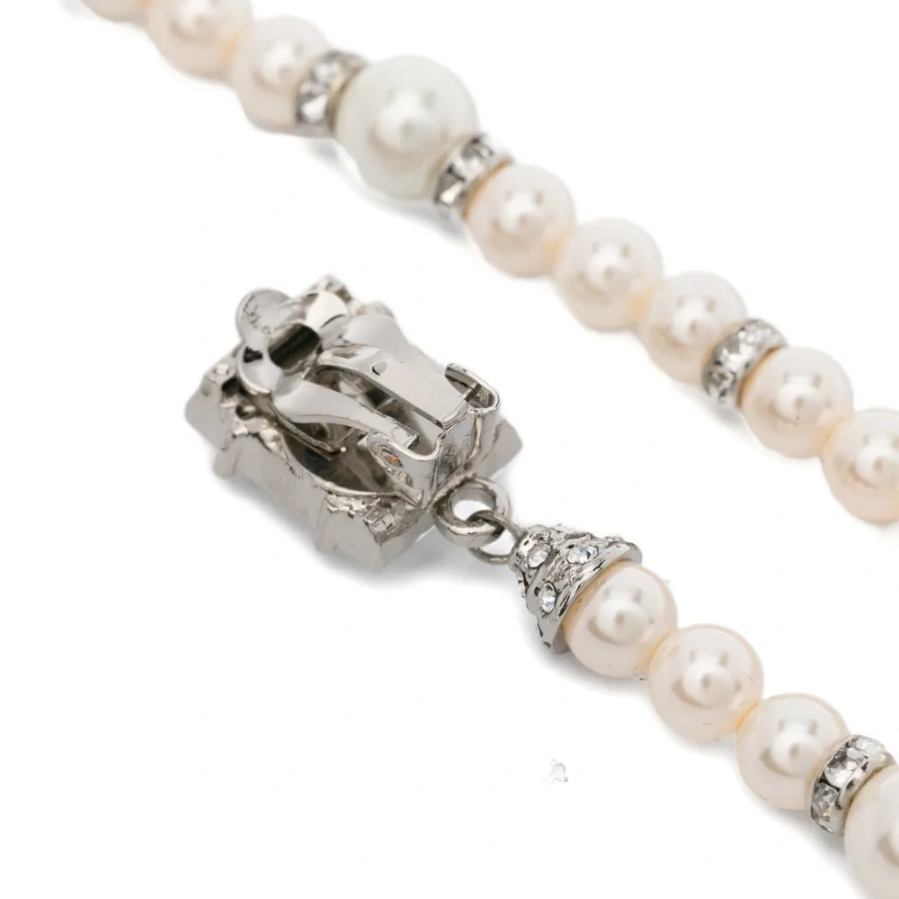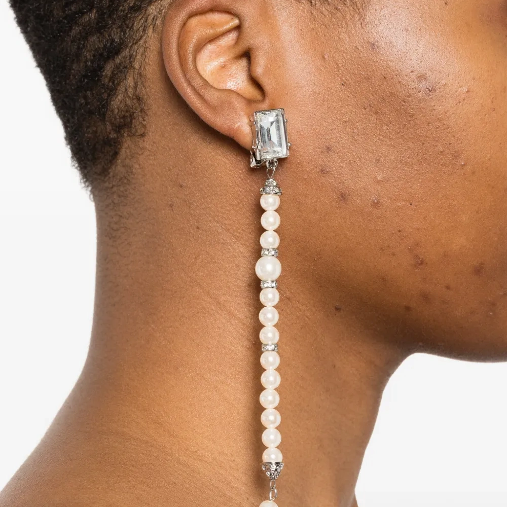 Серьги прямоугольной формы с жемчужным и кристальным декором серебристого оттенка. Поставляются в паре.